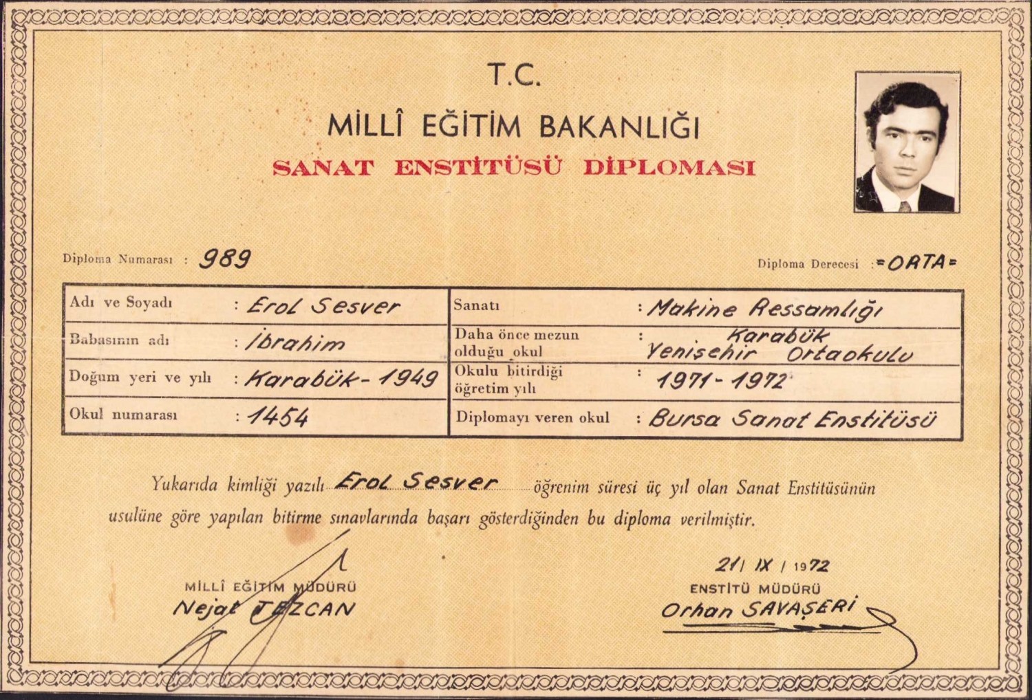 Milli Eğitim Bakanlığı Sanat Enstitüsü Diploması, Bursa damgalı, 1972 tarihli, 27x18cm