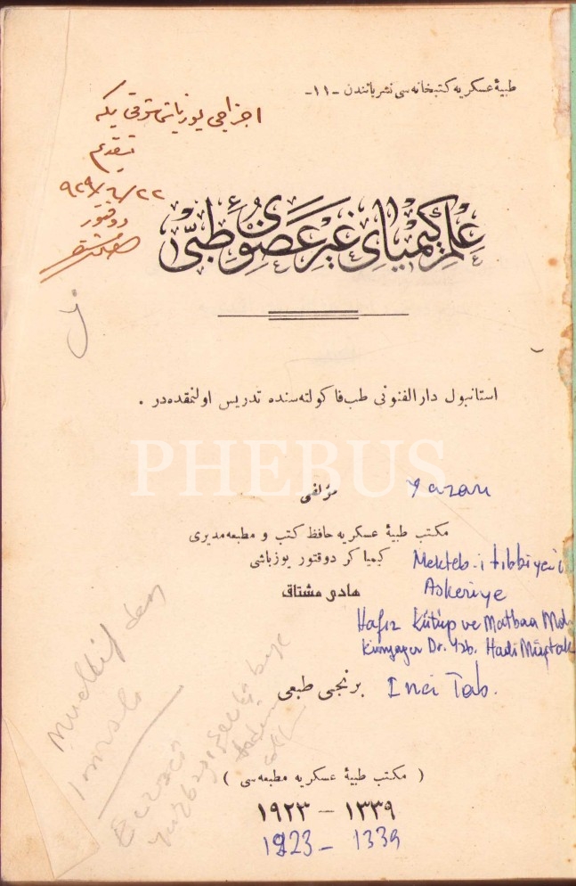 İLM-İ KİMYÂ-YI GAYRİ UZVÎ-İ TIBBÎ [1. baskı], Hadi Müştak, yazarından ithaflı ve imzalı, Mekteb-i Tıbbiye-i Askeriye Matbaası, 1923, 584 s., 14x20 cm