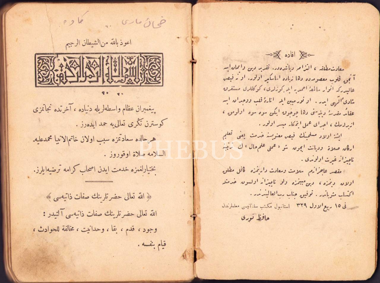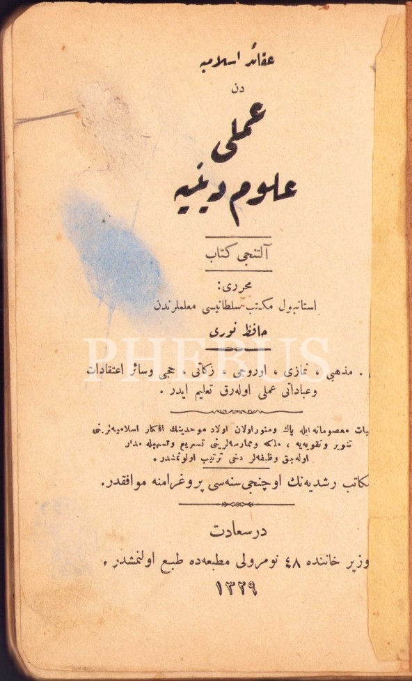 Akâid-i İslâmiyye'den AMELÎ ULÛM-I DÎNİYYE (6. Kitâb), Hafız Nuri, Dersaadet [İstanbul] 1329, 214 s., 12x18 cm, birkaç sayfası üstten yırtık haliyle