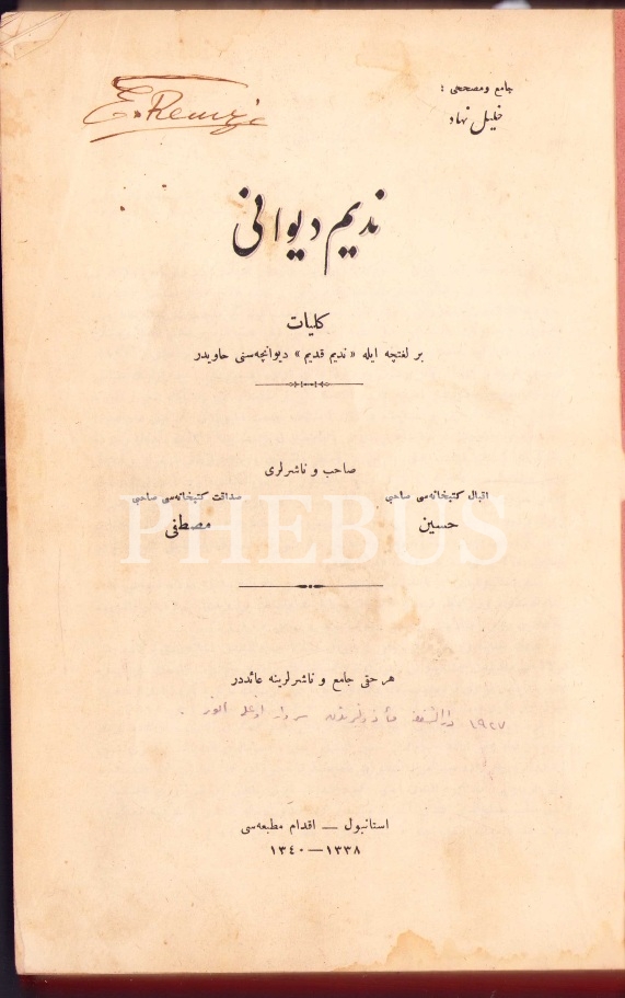 NEDİM DÎVÂNI (Külliyat), derl. Halil Nihad [Boztepe], İkdam Matbaası, İstanbul 1340, 374 s., 17x25 cm, sırtı ayrık haliyle