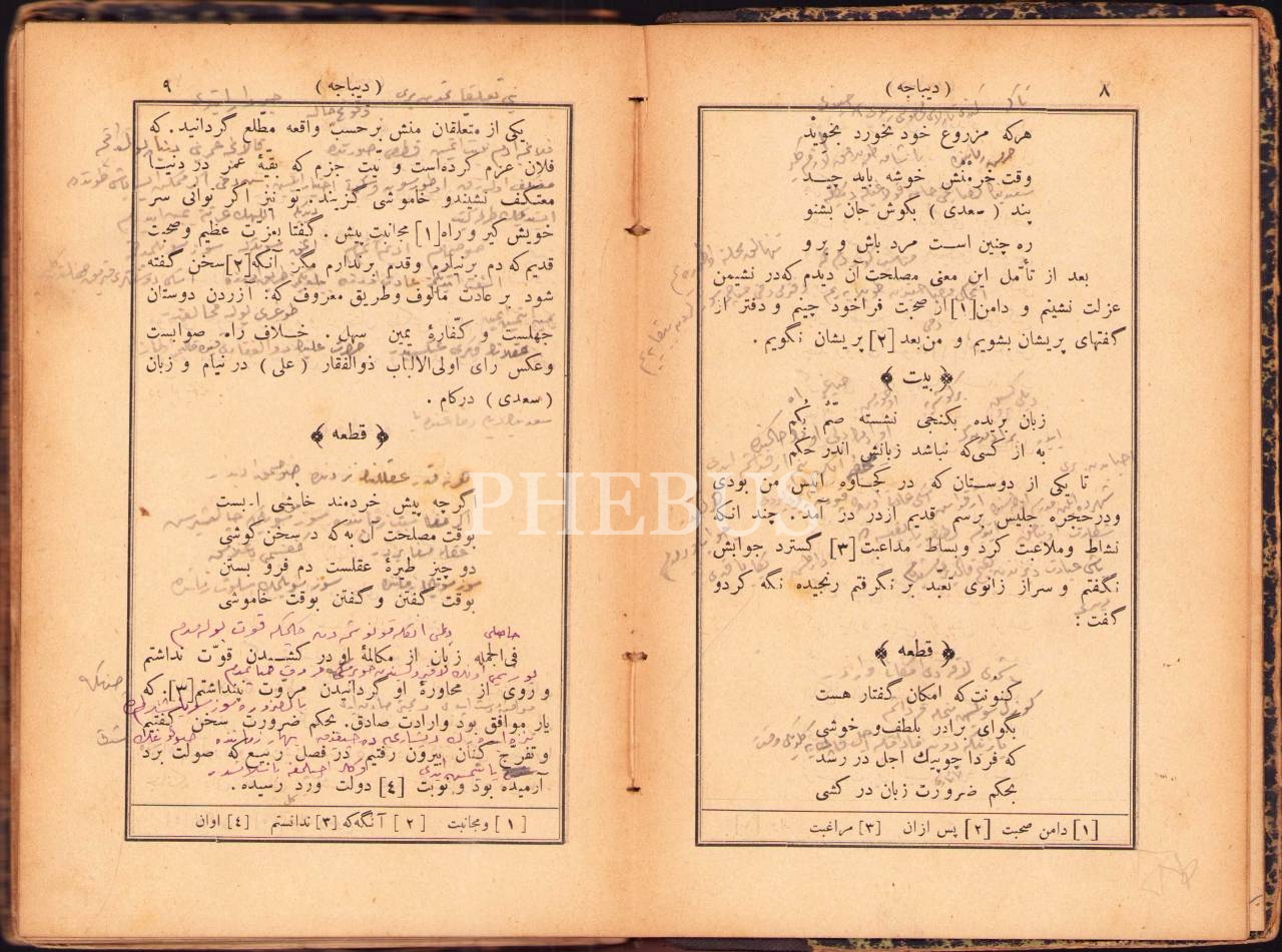 Yazıldığı tarihten bu yana büyük ilgi gören Sadi Şirazî'nin ünlü Farsça eseri Gülistan, çoğunlukla günlük hayatta karşılaşılan olaylar dikkate alınarak ahlakî ve edebî sonuçlar çıkarılabilen hikâye ve nüktelerle süslenmiş; Farsça ve Arapça şiirlerin yanı sıra ayet, hadis ve atasözlerine de yer vermiştir.