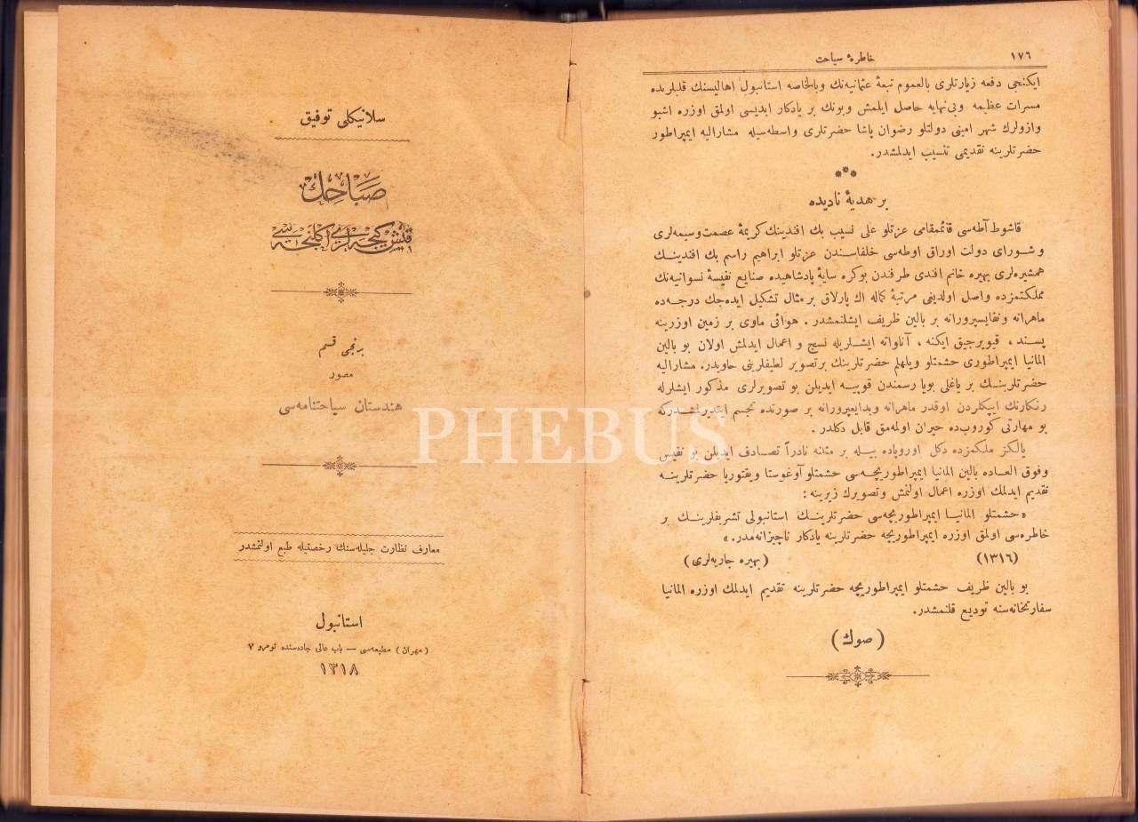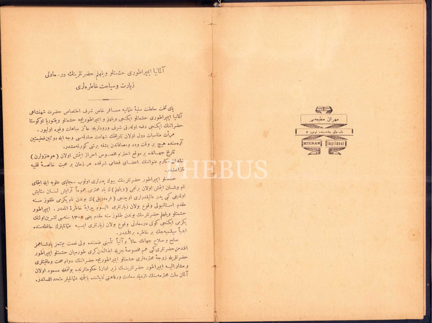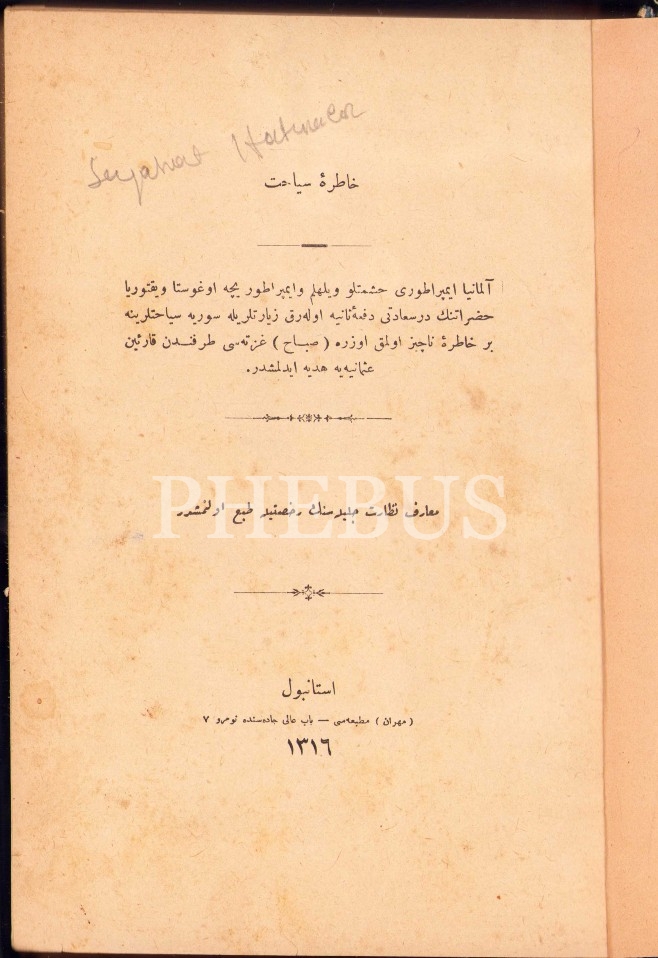 2 eser bir arada: Osmanlıca Sabah gazetesinin hediyesi olarak HÂTIRA-İ SEYÂHAT (Almanya İmparatoru Wilhelm ile İmparatoriçe Augusta Victoria'nın Hatıratı), Mihran Matbaası, İstanbul 1316, 176 s.;