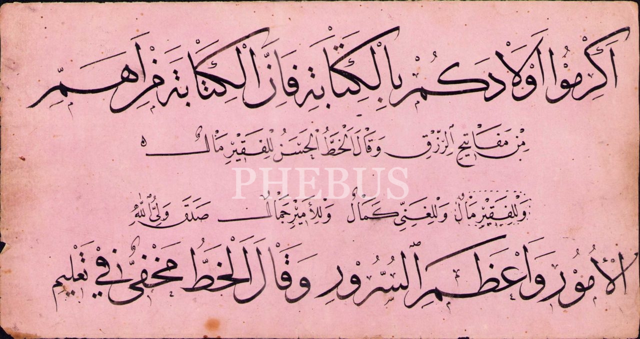 "Ekrimu evladeküm bi'l-kitabeti fe-inne'l-kitabete min ehemmi'l-umur ve a'zamü's-sürur... [Çocuklarınıza yazı yazmayı öğretin, yazma becerisi en önemli iş ve en büyük mutluluktur...]"