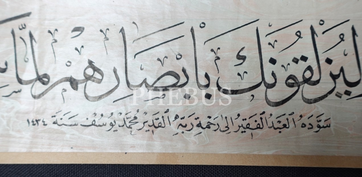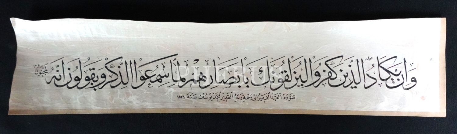 Nazar ayeti olarak bilinen Kalem Suresi 51. ayet, 1434 Muhammed Yusuf ketebeli, sülüs satır, 11x47 cm