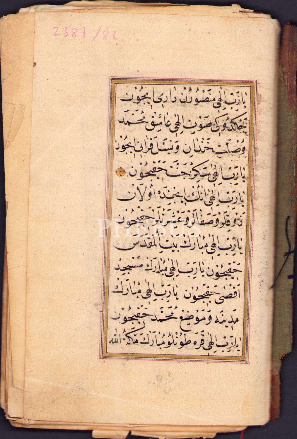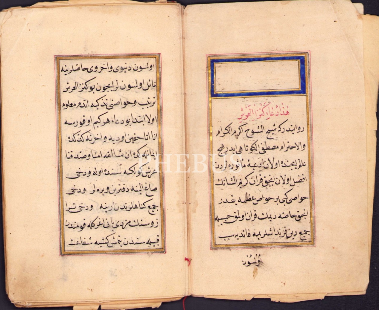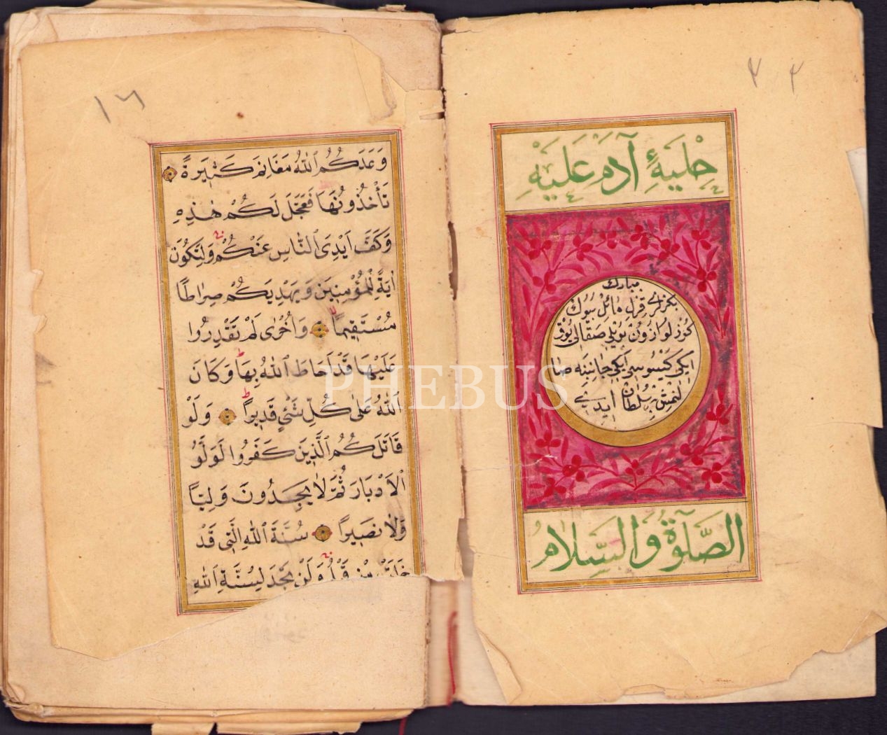 Arapça el yazması Kenz-ü'l Arş Duası ve Kur'an'dan bazı sureleri içeren bir dua mecmuasından kısımlar, iki parça halinde deri ciltli, 116 sayfa, 13x22 cm