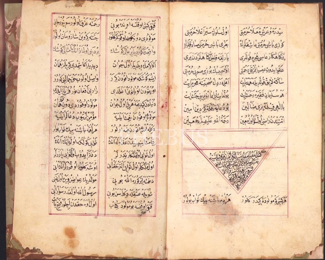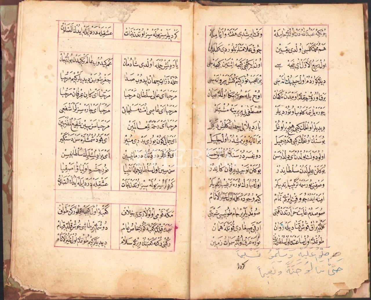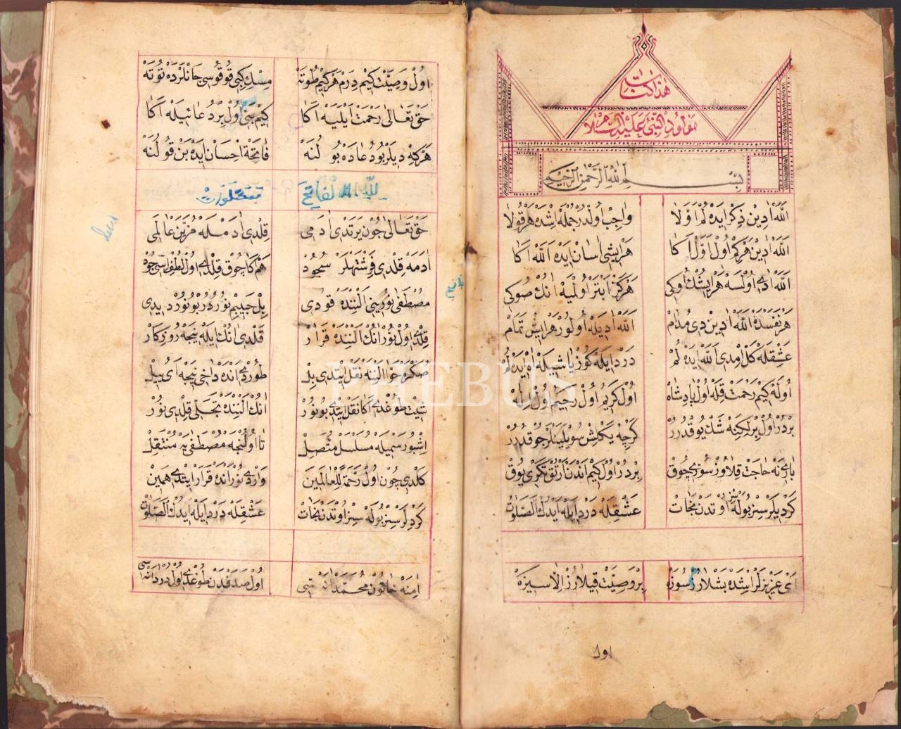 Mevlid-i Şerif metni ve mevlid okumanın ve dinlemenin faziletlerini içeren Osmanlıca yazma eser, iç kapakları ebrulu,13 sayfa, 13x20 cm