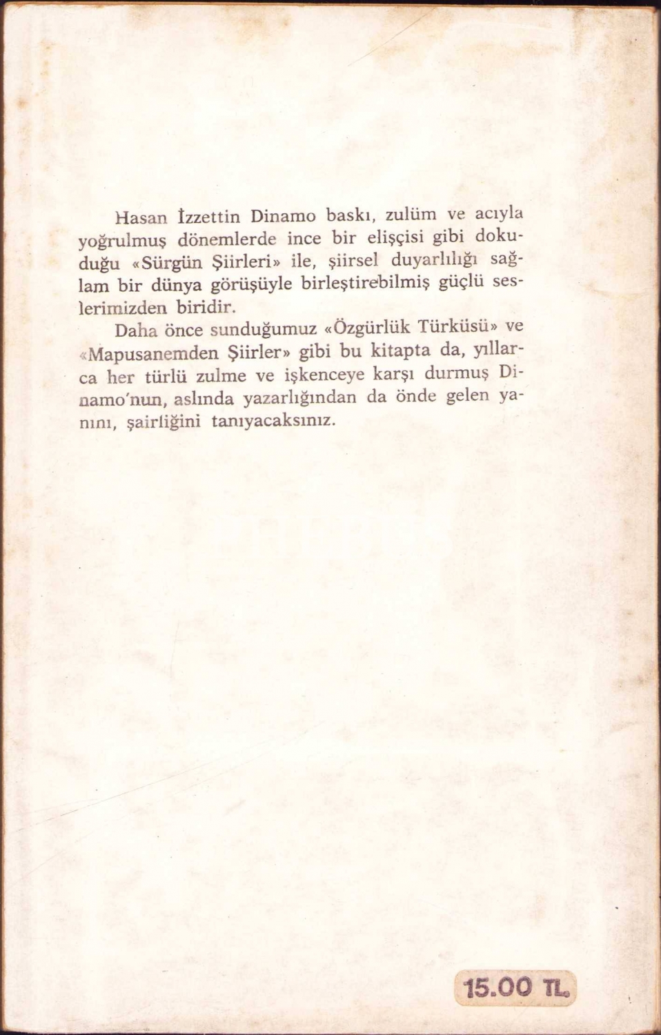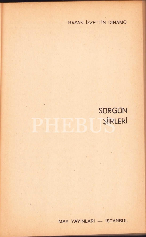 Ömrü hapislerde, sürgünlerde geçen, askerliğini ancak yedi yılda tamamlayabilen, 1940 kuşağının toplumcu – gerçekçi şair ve yazarı Dinamo’nun (1909 – 1989), "Sürgün Şiirleri”nin birinci basımı… "Hey tarla kuşu hey / Sürgün yokuşundan dik değil / Göğün mavi yokuşu"