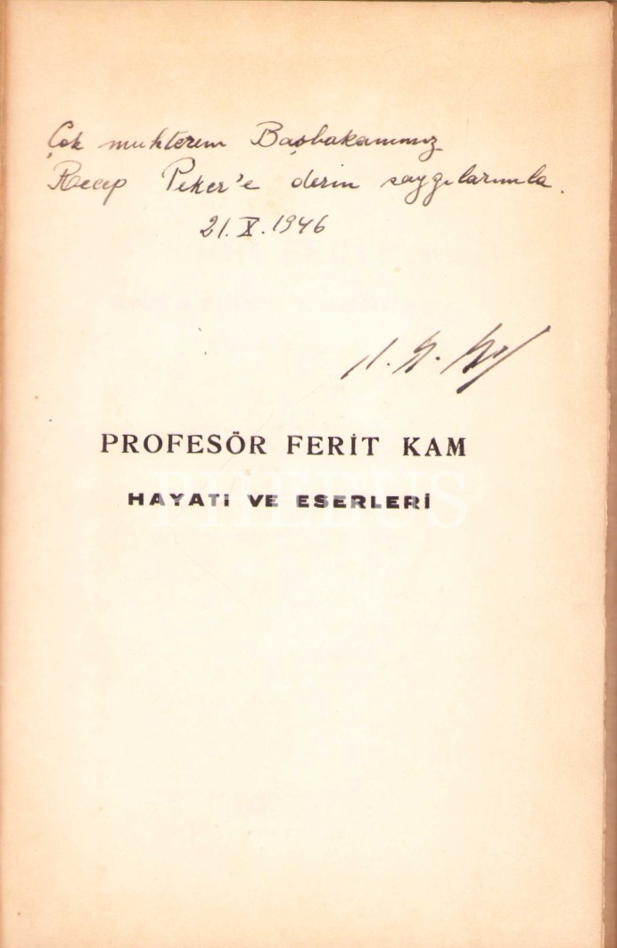 Edebiyat tarihçiliği ve dilciliği yanı sıra, biyografi çalışmalarıyla da Türk edebiyatına büyük katkılar sağlamış olan Prof. Agâh Sırrı Levend'in (1894 - 1978); klasik Türk ve Fars edebiyatları üzerine yaptığı incelemelerle tanınan Prof. Ferid Kam (1864 - 1944) biyografisi... Çok partili dönemin ilk başbakanı olan ve 1946 - 1947 yıllarında başbakanlık yapmış olan Recep Peker'e imzalı... Döneminde yapılmış, usta işi, siyah bez cildi içinde...