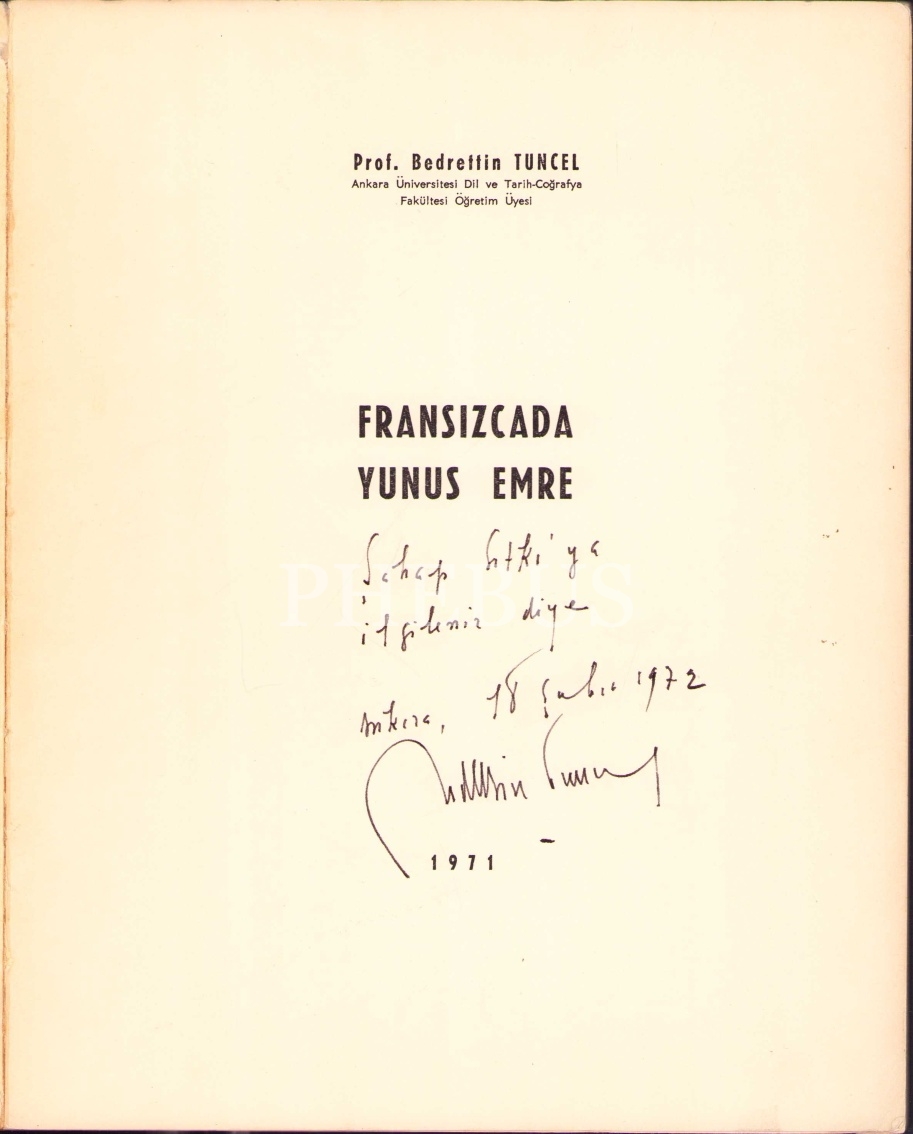 FRANSIZCA'DA YUNUS EMRE, Prof. Bederettin Tuncel, 1971, Başnur Basımevi, 62 sayfa, 20 X 25 cm… Şahap Sıtkı İlter'e imzalı…