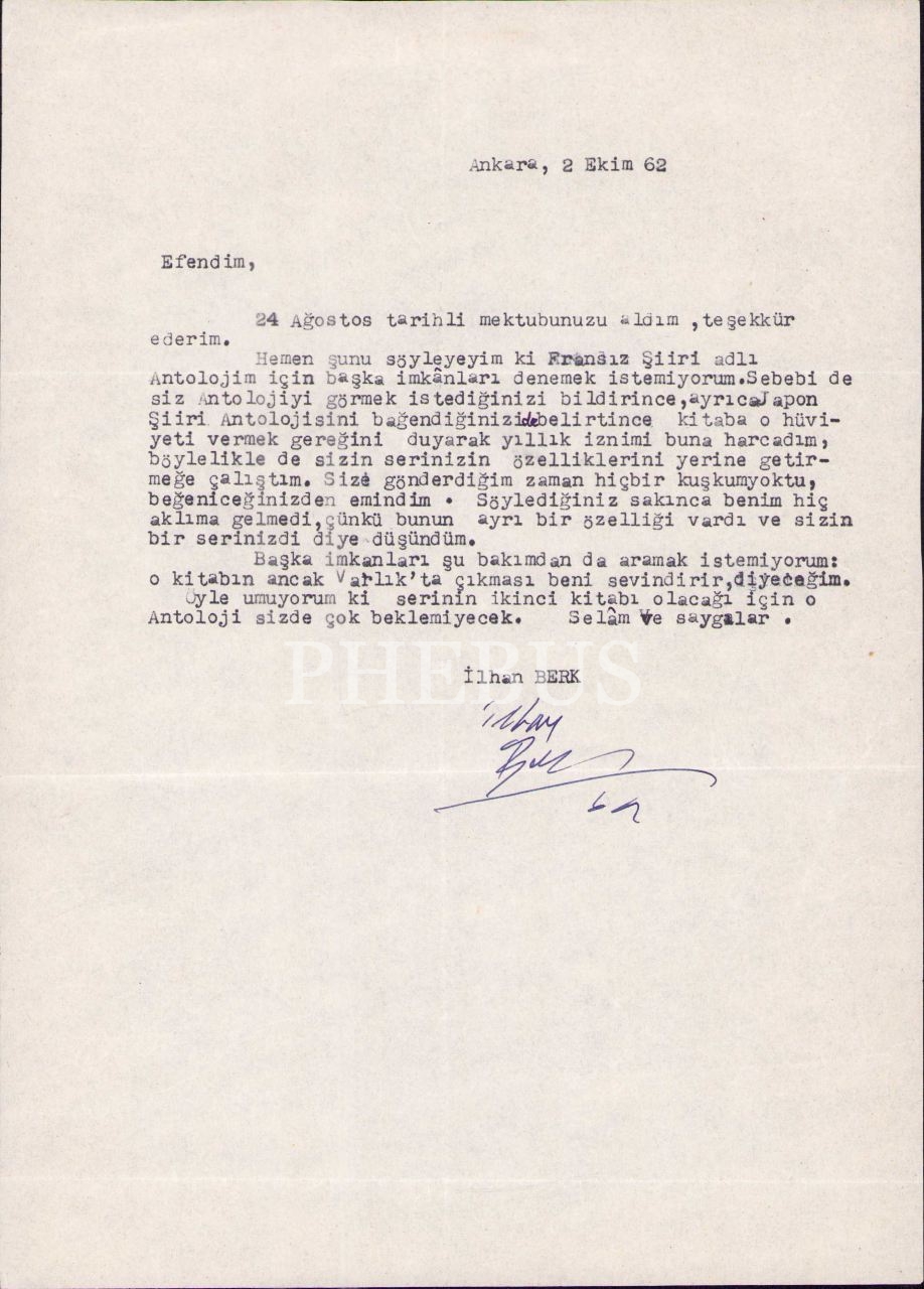 Türk şiirinin durmadan kendini yenileyen, en deneyci şairlerinden İlhan Berk'in (1918 - 2008), Varlık Yayınları sahibi Yaşar Nabi Nayır'a (1908 - 1981) yazdığı 2 Ekim 1962 tarihli mektubu… Şair, hazırlamış olduğu Fransız Şiiri Antolojisi'nin bir an önce basılmasını bekliyor ve "başka imkânlar denemek istemediğini, o kitabın ancak Varlıkta çıkmasının kendisini sevindireceğini" belirtiyor. (Ne var ki, İlhan Berk'in "Başlangıcından Bugüne Fransız Şiiri Antolojisi" adlı kitabı, ancak 2001 yılında ve İş Bankası Kültür Yayınları tarafından yayımlanabildi.)