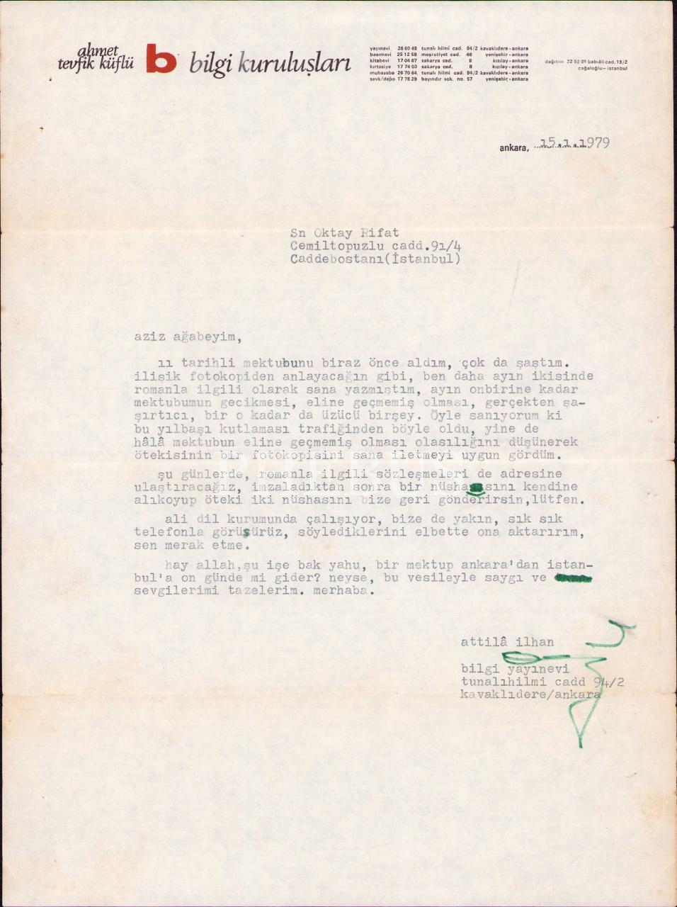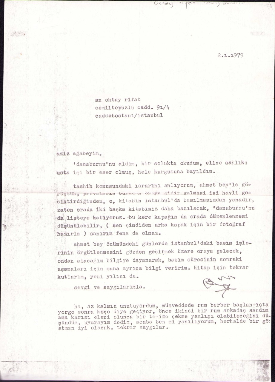 Attila İlhan'ın (1925 - 2005) Bilgi Yayınları'nda editörlük yaptığı dönemde Oktay Rifat'la (1914 - 1988) "Danaburnu" romanı dolayısıyla yazışması… Attila İlhan, muhtemelen Oktay Rifat'ın sitemine karşılık, daha önce yazdığı ama ona ulaşmayan mektubun bir kopyasını da mektubuna eklemiş. "Bir Kadının Penceresinden" adlı romanı Bilgi Yayınevi tarafından yayımlanan Oktay Rifat, mektuba göre, "Danaburnu" için de aynı yayınevini tercih etmiş ve Attila İlhan da sevinerek kabul etmiş. Ama nedense kitap daha sonra Karacan Yayınları tarafından basıldı.