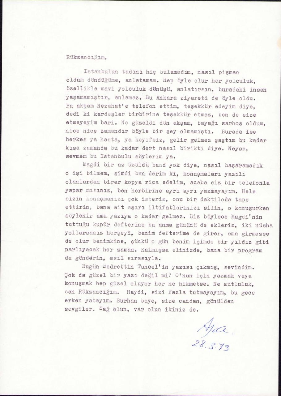 Özellikle, A. Kadir'le birlikte yaptıkları, aşılması imkânsız İliada ve Odysseia çevirileriyle tanınan, eski Yunan ve Roma dilleri uzmanı, filolog, arkeolog ve denemeci Azra Erhat'tan (1915 - 1982), dönemin edebiyatçılarının yakından tanıdığı, TED Ankara Koleji'nin efsane edebiyat öğretmeni Rüksan Günaysu'ya yazılmış mektup, zarfıyla birlikte... "... Ne güzeldi dün akşam, bayağı sarhoş oldum, nice nice zamandır böyle bir şey olmamıştı... Bugün Bedrettin Tuncel'in yazısı çıkmış, sevindim. Çok da güzel bir yazı değil mi? O'nun için yazmak ve konuşmak hep güzel oluyor her ne hikmetse. Ne mutluluk can Rükzancığım..."