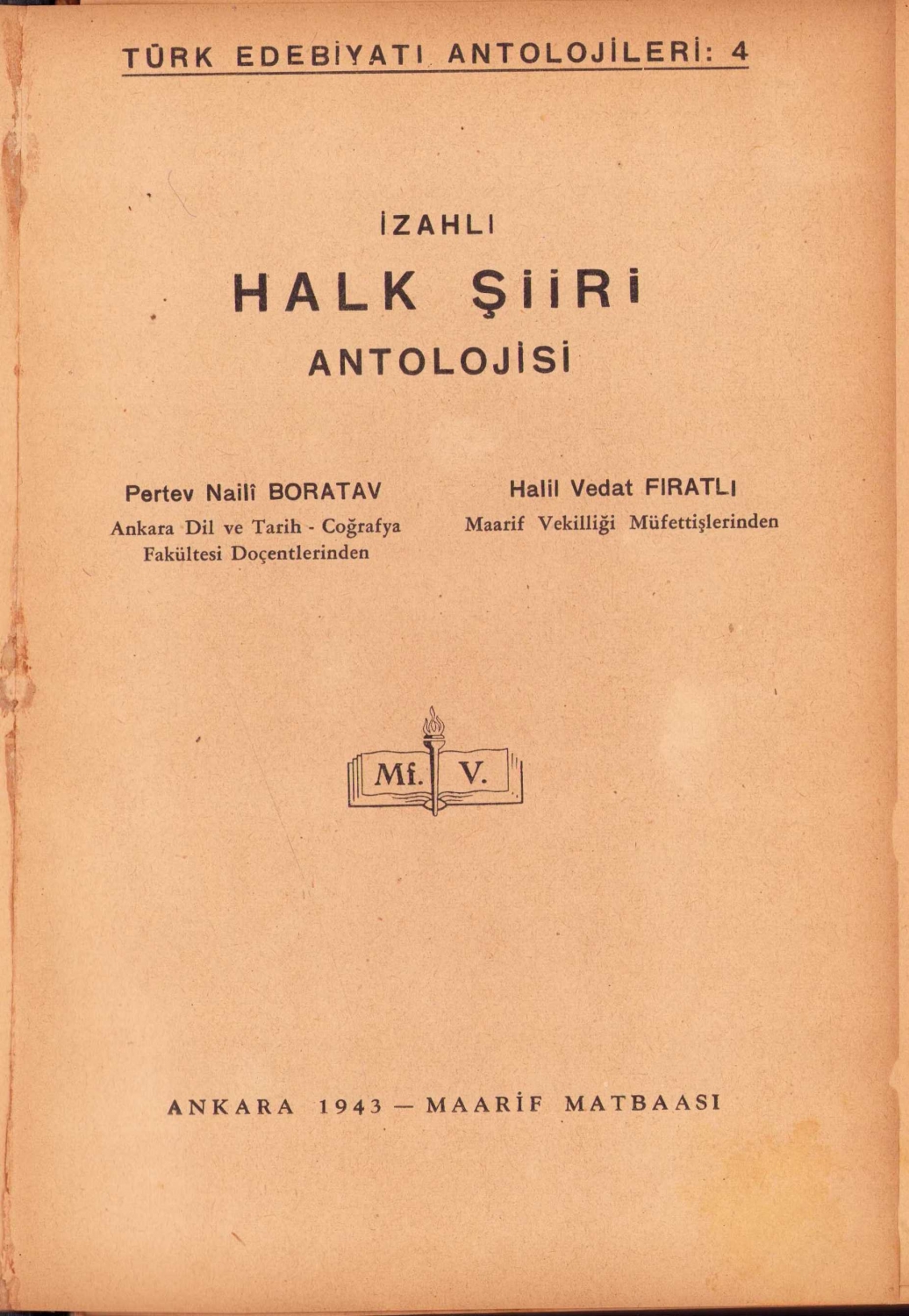 Türk Edebiyatı Antolojileri:4 İzahlı Halk Şiiri Antolojisi, Pertev Naili Boratav - Halil Vedat Fıratlı, Ankara, 1943, 271 sayfa, 16x23cm