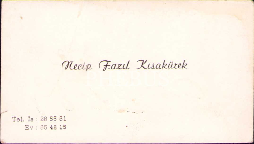 NECİP FAZIL'IN, ARKASINDA''MATBU'' EL YAZISI BULUNAN KARTVİZİTİ, 9 X 5 cm…