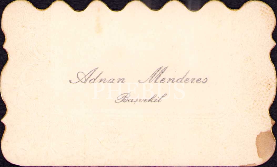 1950 - 1960 yılları arasında başbakanlık yapan ve 27 Mayıs Darbesi'yle görevine son verilerek 1961 yılında idam edilen Adnan Menderes'in (1899 - 1961), kenarları altın yaldızlı ve baskı işlemeli, son derece şık kartviziti…