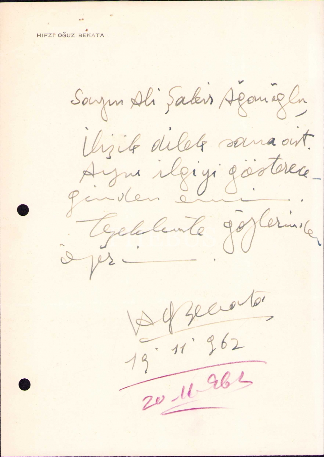 1933 – 1948 arasında 193 sayı yayımlanan Çığır dergisinin kurucusu ve başyazarı, 27 Mayıs sonrasında Kurucu Mecli Üyesi ve daha sonra da İçişleri Bakanı olan Hıfzı Oğuz Bekata'nın (1911 - 1995), yine bir siyasetçi olan Ali Şakir Ağanoğlu'na gönderdiği bir "rica" mektubu... "Aynı ilgiyi göstereceğinden eminim." Yazılı ve imzalı kartvizitiyle birlikte...