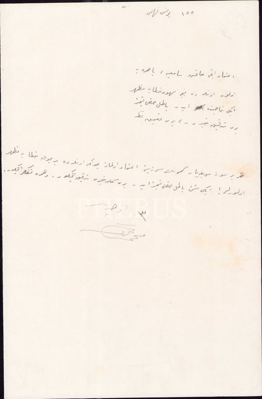 İstiklal Marşı'mızın şairi Mehmed Âkif (1873 - 1936), II: Meşrutiyet sonrasında İttihat ve Terakki'nin Şehzadebaşı İlmiye Mahfelinde Arap edebiyatı, Darülfünun’da da Edebiyat-i Osmaniye dersleri vermeye başlamıştı. Müzayedeye sunulan imtihan kâğıdı, muhtemelen bu dönemde tahsil gören, Yunus Fehmi adlı, 155 numaralı bir talebeye aittir ve Âkif'in takdiri 3 (üç) puan olmuştur. Filigranlı, gofreli kâğıda...