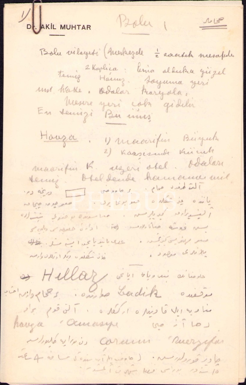 SÜHEYL ÜNVER'İN KENDİ EL YAZISIYLA; BOLU, ERZURUM, ERZİNCAN,KARS, ANKARA GİBİ İLLERDE BULUNAN KAPLICALARLA İLGİLİ, LATİNCE - OSMANLICA NOTLARI, 14 X 22 cm, 4 yaprak...