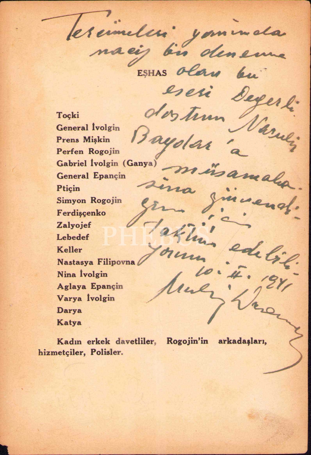 Dostoyevski'nin "Budala" romanının tiyatro uyarlamasını "Abdal" adıyla çeviren şair Ahmet Muhip Dıranas'ın (1909 - 1980), Fransızcadan çok sayıda eser çevirmiş olan Nasuhi Baydar'a ithafı… "Tercümeleri yanında aciz bir deneme olan bu eseri, dostum Nasuhi Baydar'a..." (Müzayedeye sunulan ürün, söz konusu kitabın tamamı değil, yalnızca ithaf sayfasından ibaretttir.)