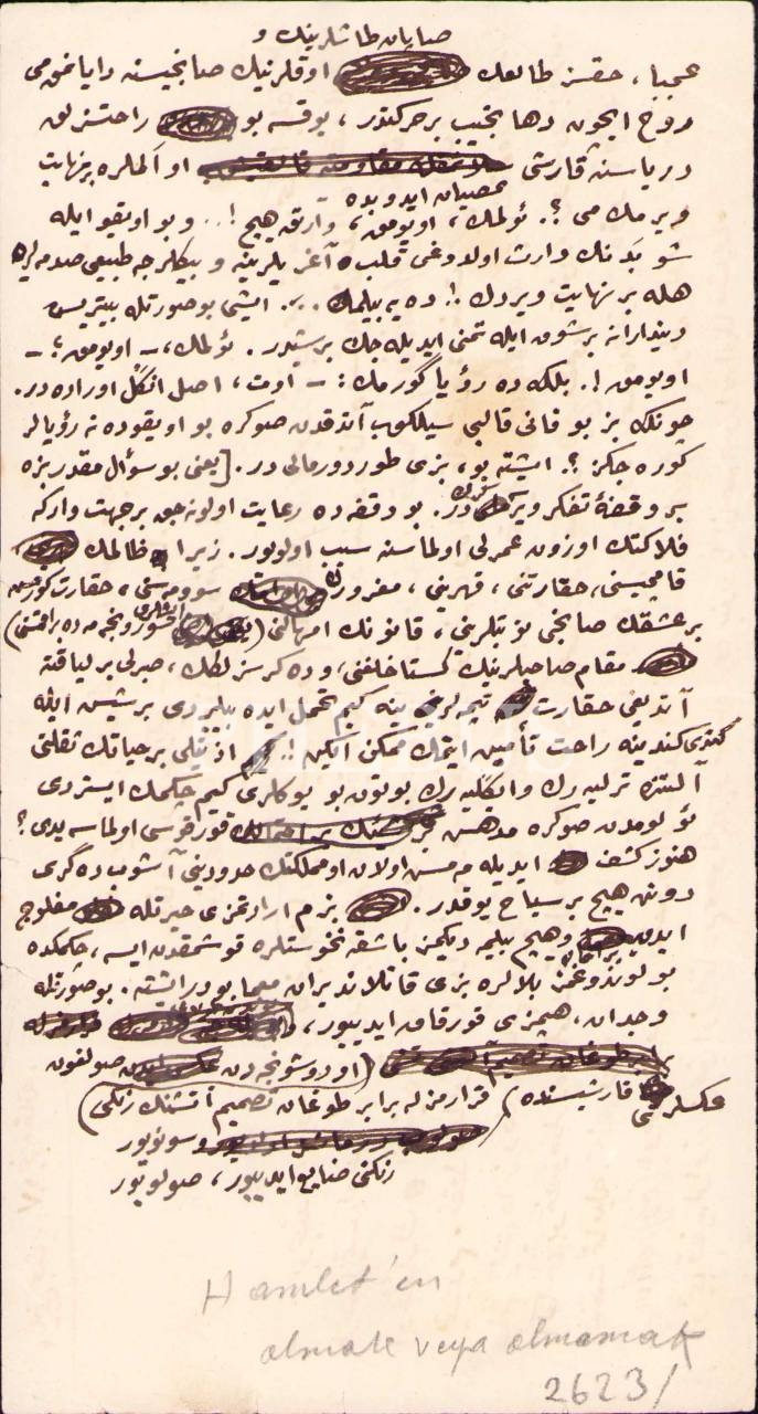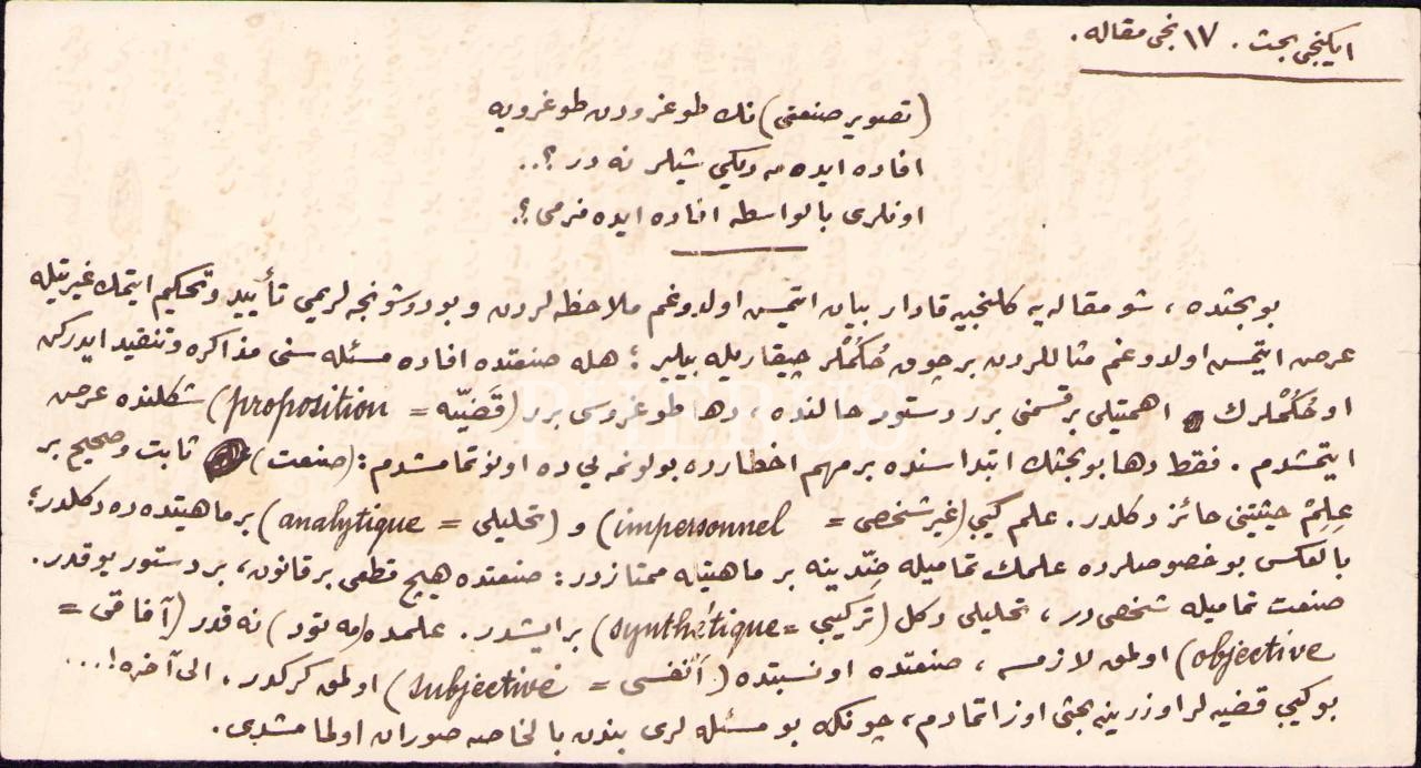 Aslında Mekteb-i Tıbbiye mezunu olmasına ve felsefe eğitimi almamış olmasına karşın, felsefeye ilgisi nedeniyle “Feylesof Rıza” olarak tanınan ve felsefeci, siyasetçi ve şair kimliğiyle son dönem Osmanlı aydınlarının en ilginç simalarından biri olan Rıza Tevfik'in (1869 – 1949) terekesinden çıkmış; muhtemelen konferansları ya da dersleri için aldığı notlar... "İkinci Bahis, 17. Makale. Tasvir sanatının doğrudan doğruya ifade edemediği şeyler nedir?..."