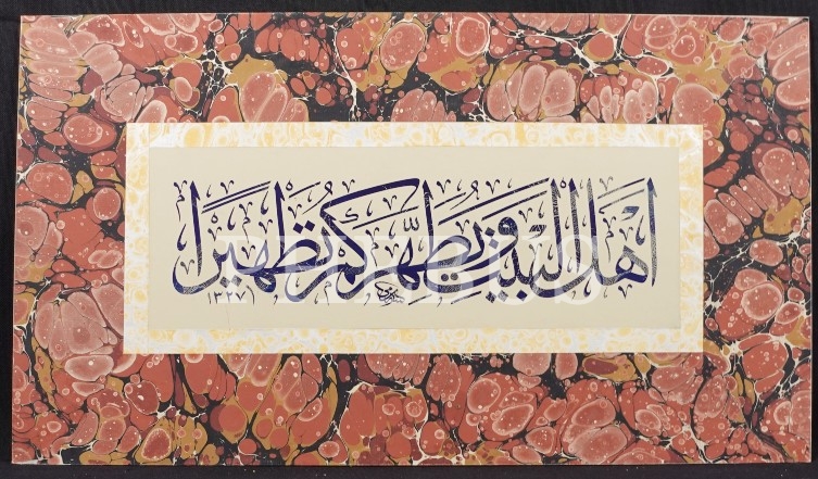 Akkase ebru tekniği ile Sami Efendi'nin yazısı ( Ahzab/33.ayet) , ebru pervazlı ve cetvelli, yazı: 12x34 cm