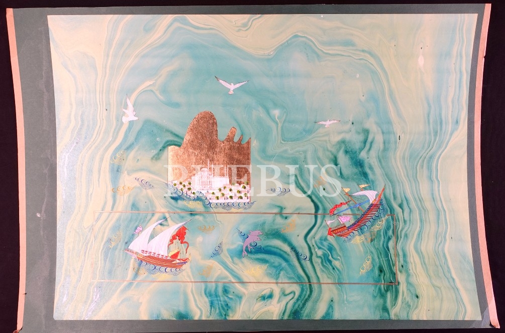 Özcan Özcan imzalı ebru üzeri minyatür çalışması 54x80 cm