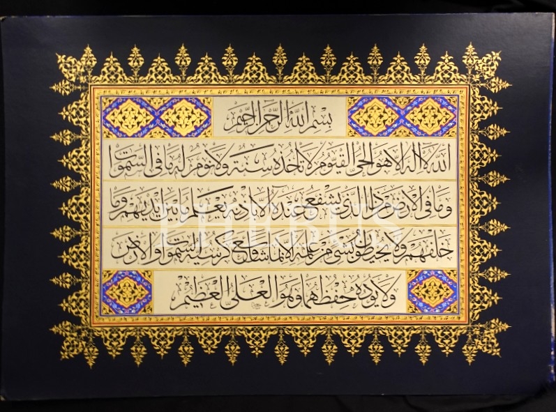 Sülüs Ayete'l-Kürsi levhası, tezhipli, Hayri ketebeli, 70x100 cm