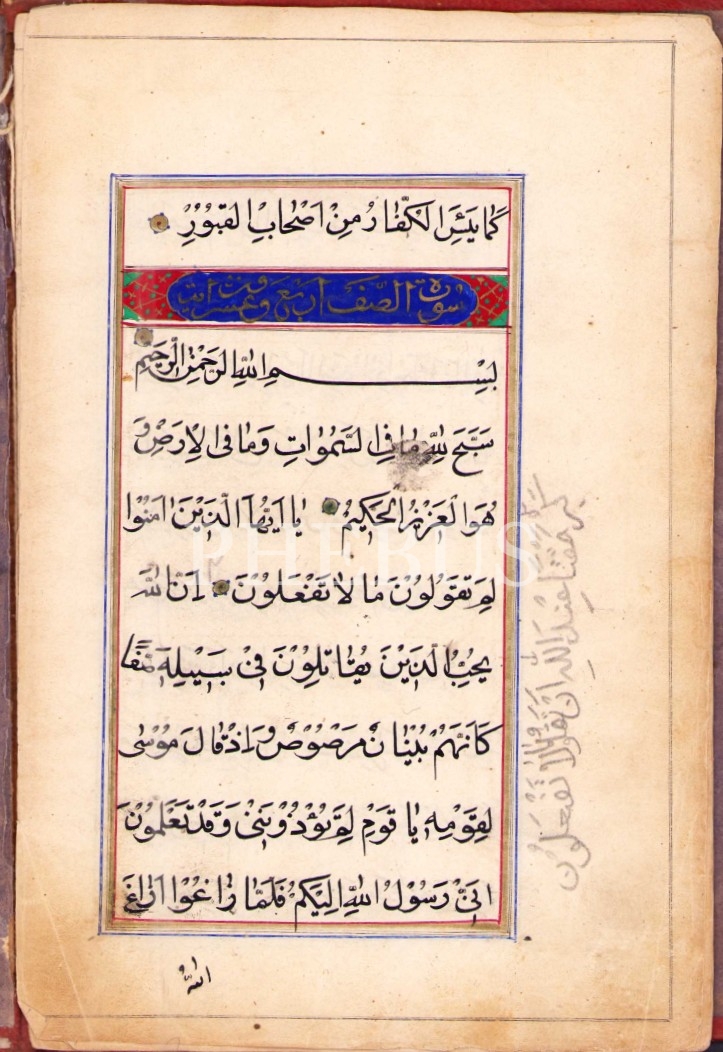 Mücâdele Sûresi (8. ayetten itibaren), Saff Sûresi (eksik ayetleri mevcut), Haşr Sûresi, Mümtehine Sûresi, 15x21 cm, sayfaları ayrık haliyle