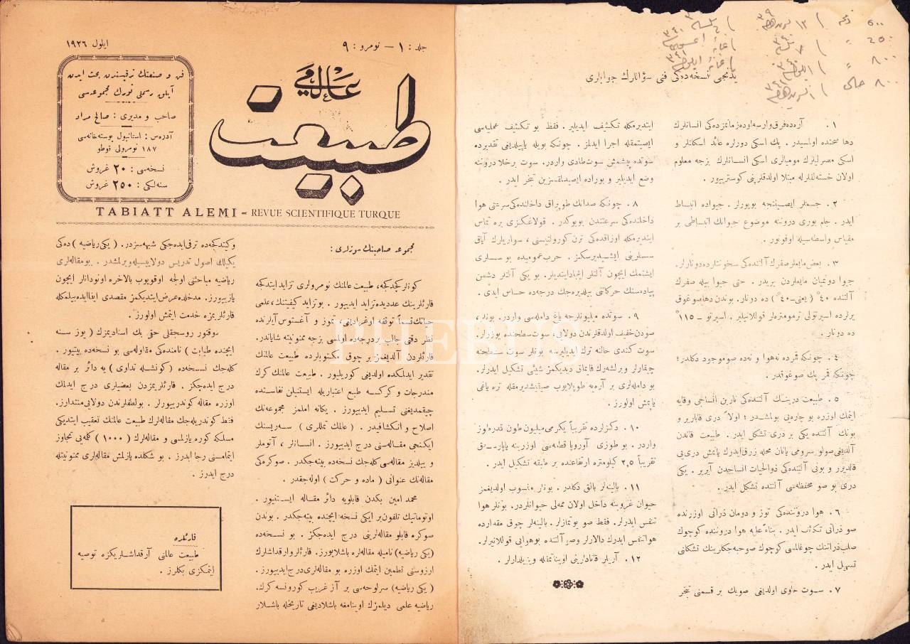 "Fen ve sanat terakkisinden bahseden Türk mecmuası" Tabiat Alemi dergisinin 9. sayısı, Eylül 1926, 20x27 cm