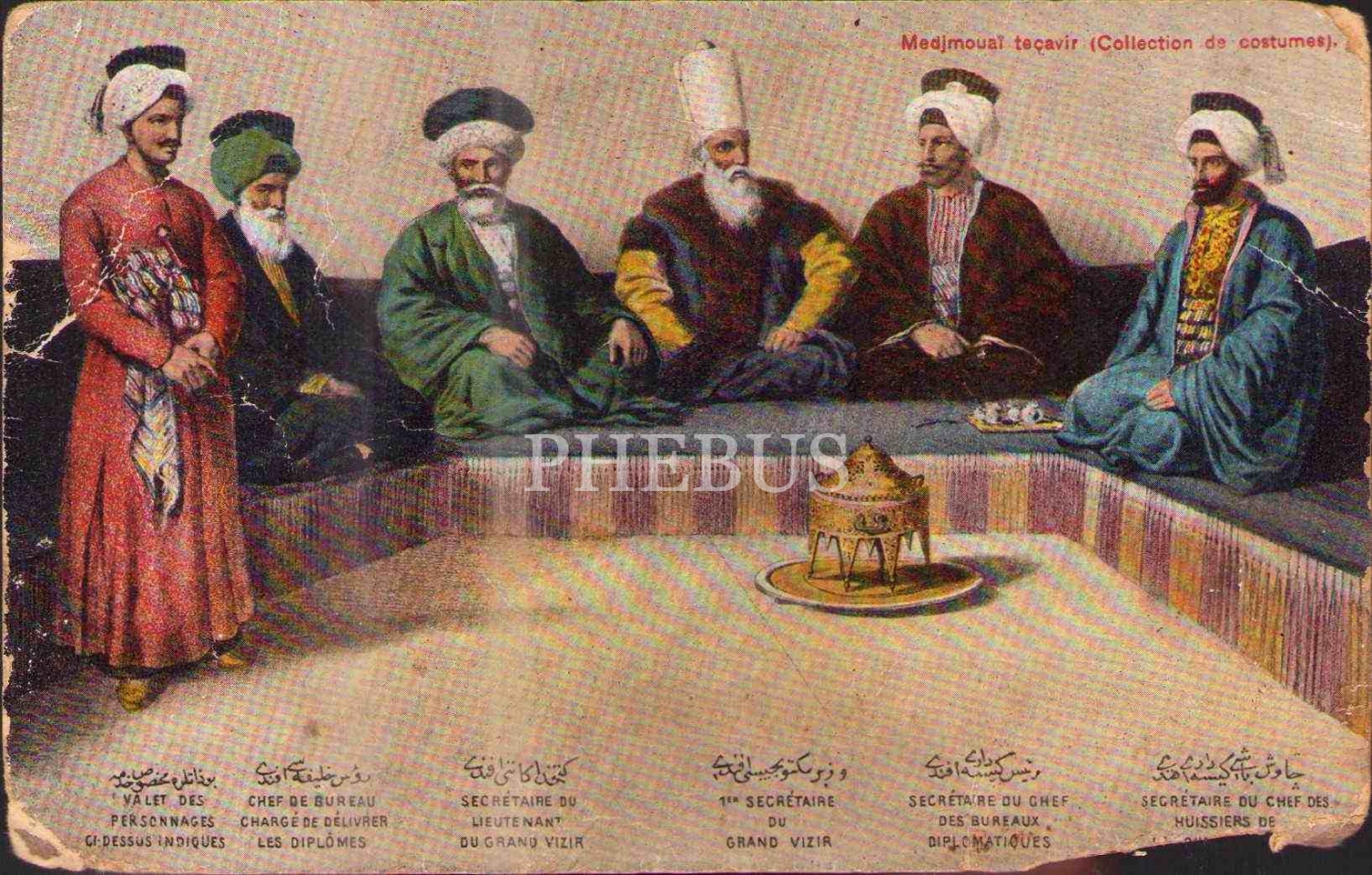 Kostüm kartpostalı: çavuşbaşı kesedarı, vezir mektupçusu, kethüda katibi vd., ed. Max Fruchtermann, Constantinople, köşeleri kırık haliyle
