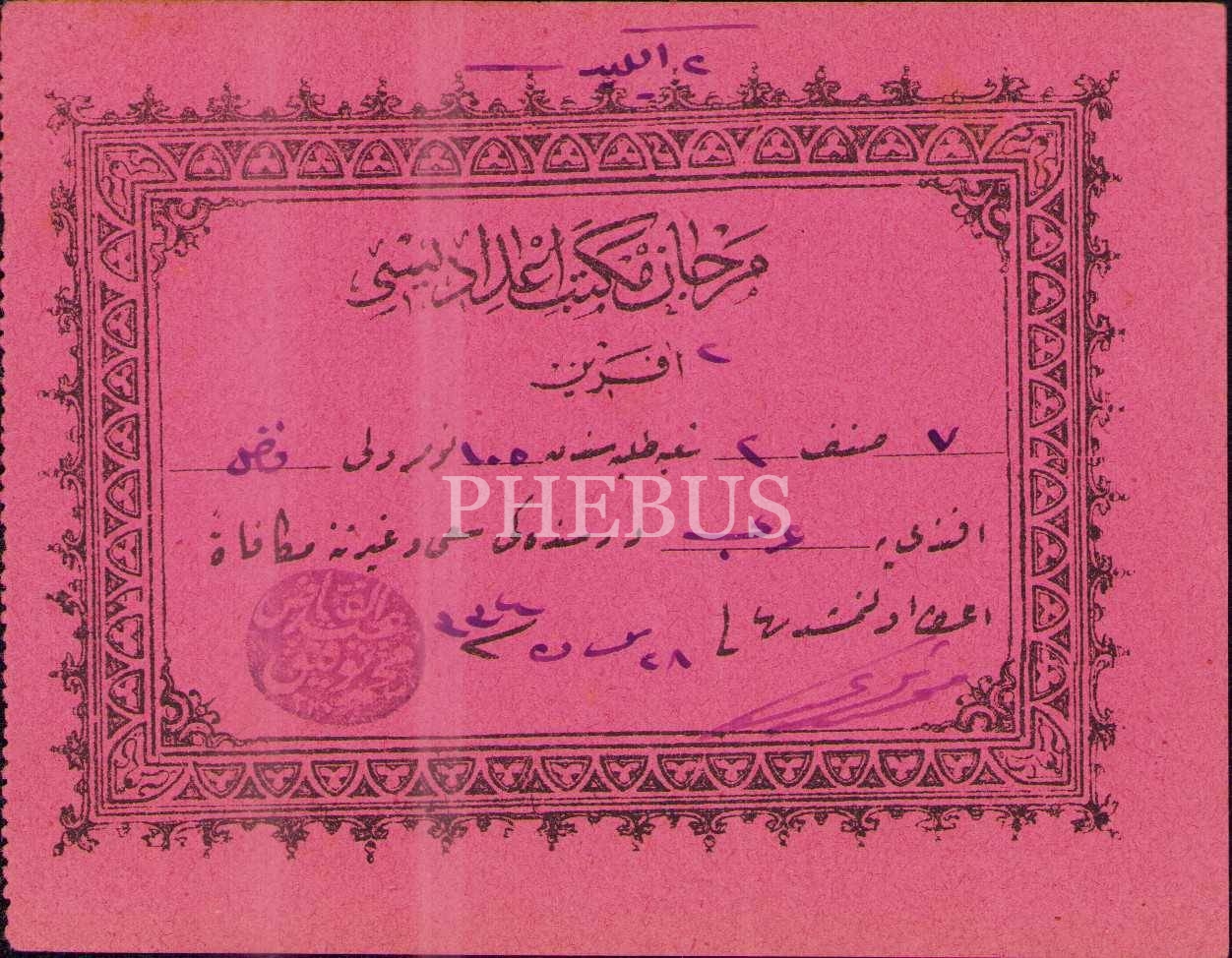 Mercan Mekteb-i İdadisi'nden Arapça dersi için 1334 tarihli aferin kâğıdı, 8x10 cm