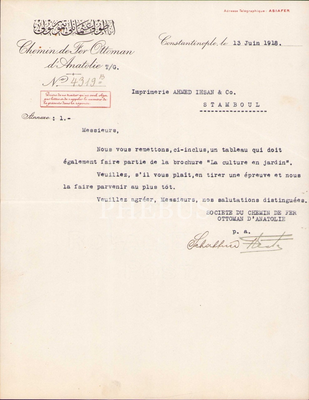 Anadolu Osmanlı Demiryolu Şirketi'nden Matbaacı Ahmed İhsan ve Şürekası'na gönderilmiş Fransızca mektup, Constantinople 1918, 21x27 cm