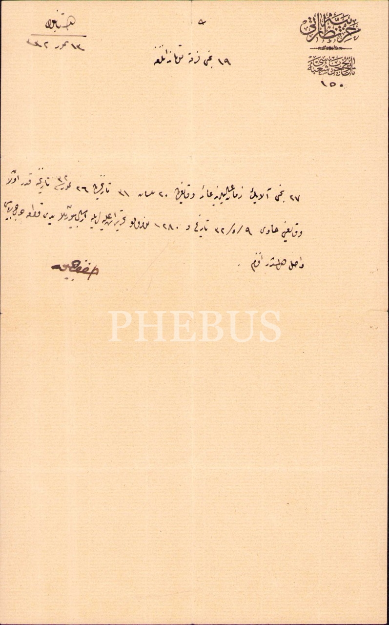 Harbiye Nezareti Tarih-i Harb Şubesi antetli mektup, İstanbul 1332, 16x26 cm, bir kenarı hafif yırtık haliyle