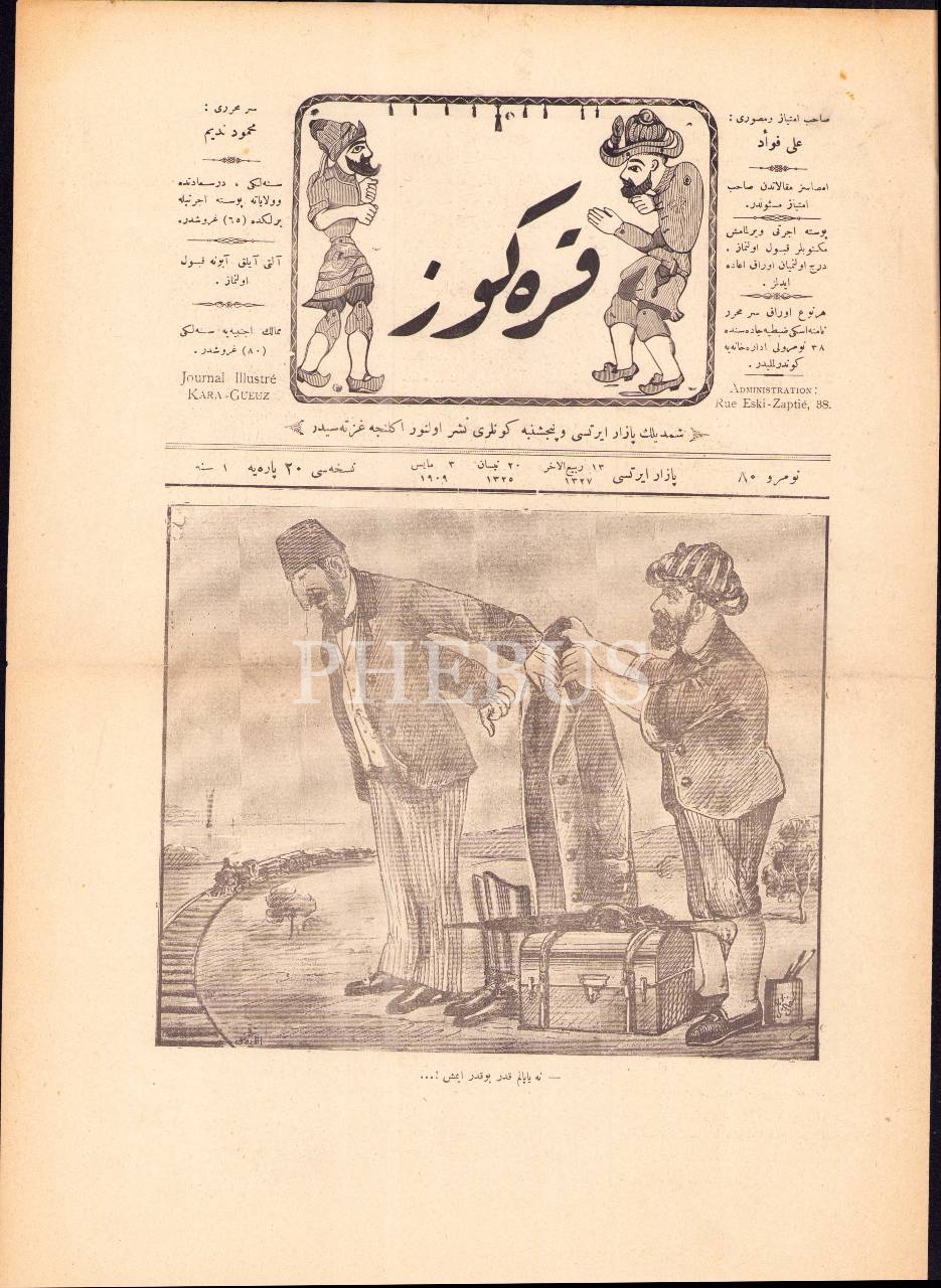 Eğlence gazetesi Karagöz'ün 80. sayısı, 3 Mayıs 1909, Sultan 2. Abdülhamid görselli kapağıyla, 28x40 cm