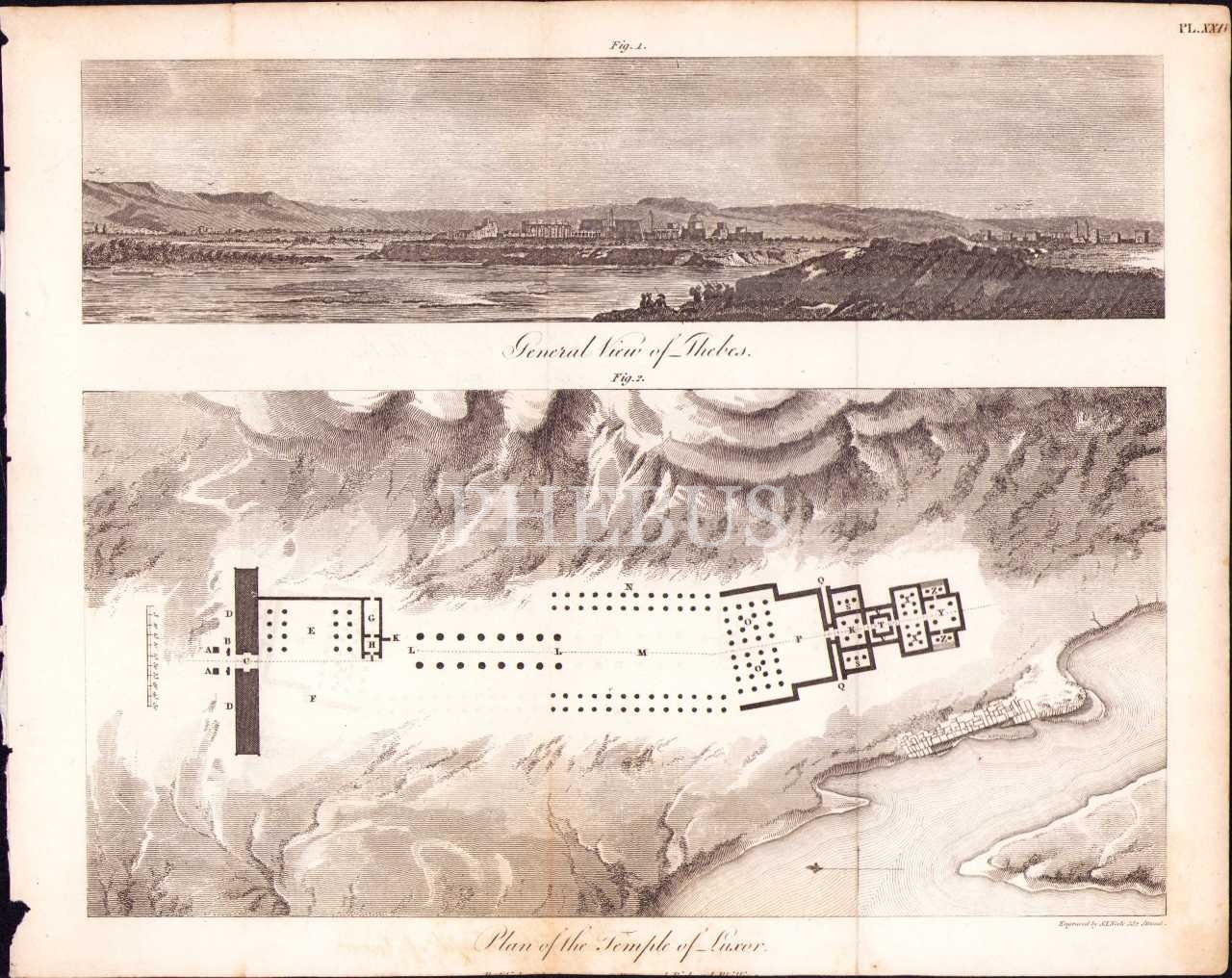 Mısır konulu gravürler: Luksor Tapınağı planı ile Thebes [Teb] genel görünümü, 21x26 cm