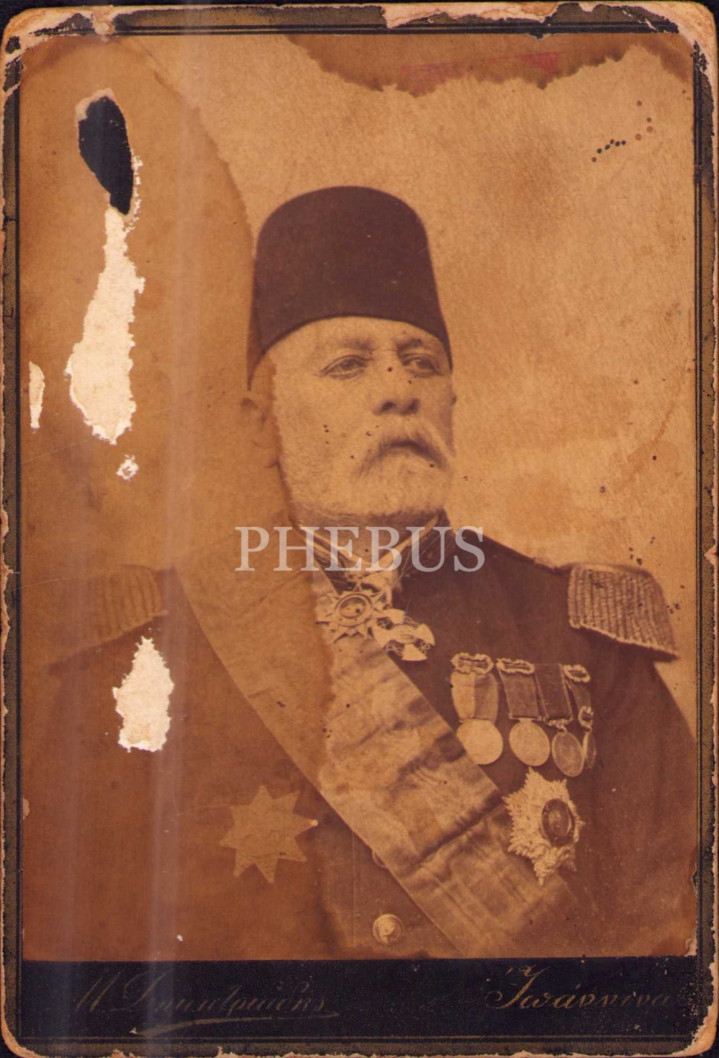 Madalyalı ve nişanlı Osmanlı paşasının Yanya'da çekilmiş kabin fotoğrafı, Rumca fotoğrafhane damgalı, 11x16 cm
