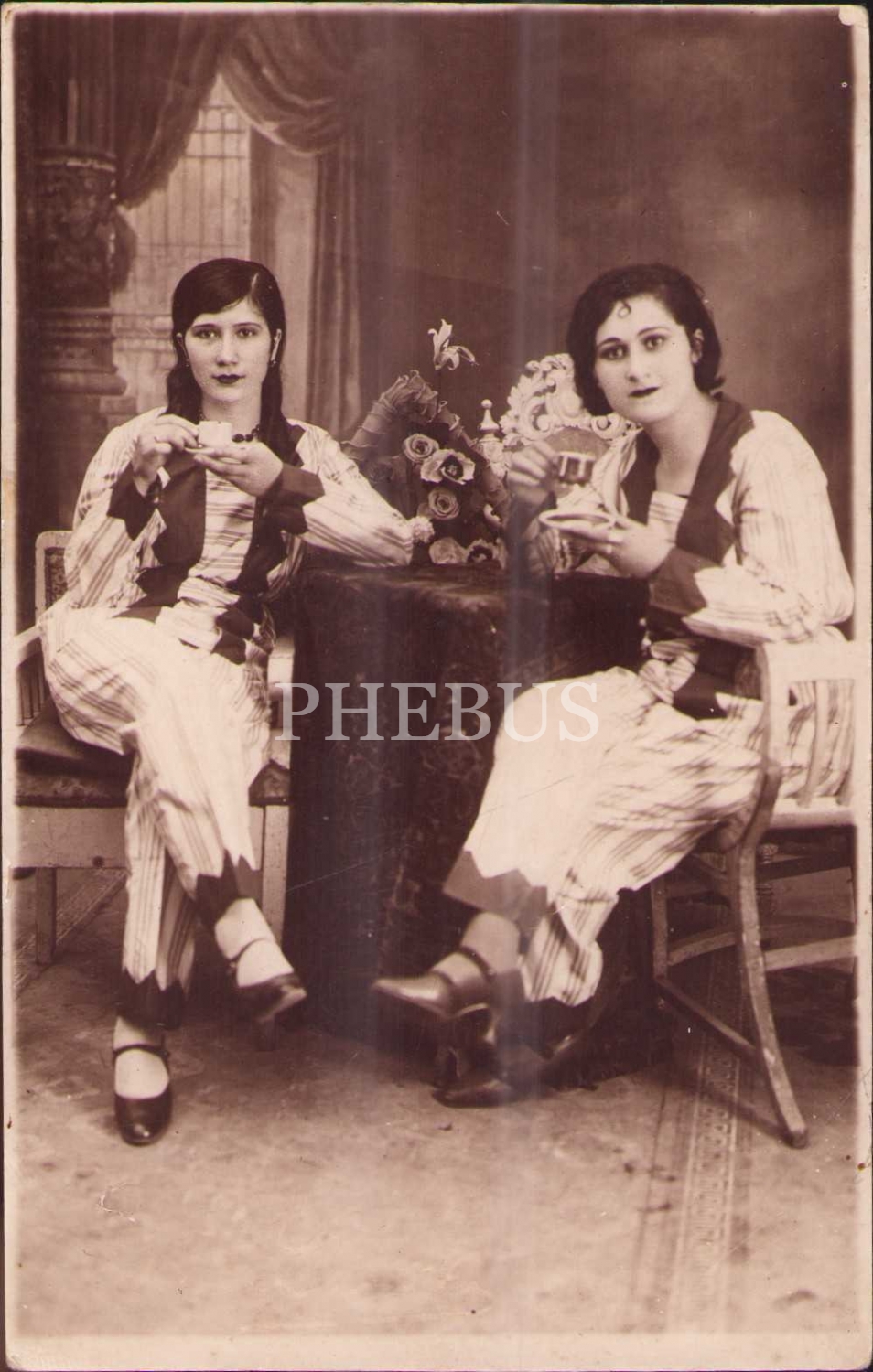 Kahve fincanlarıyla poz veren genç hanımefendiler, Lüks Fotoğrafhanesi damgalı