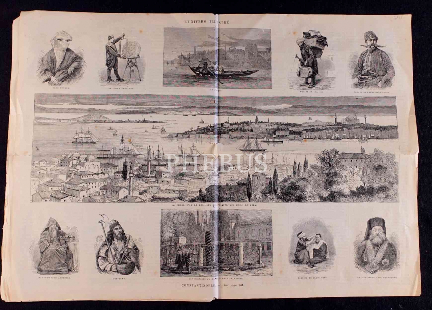 L'Univers Illustre gazetesinden İstanbul manzarası ve çeşitli Osmanlı tiplerin de yer aldığı çeşitli gravürler, 6 s., 28x39 cm