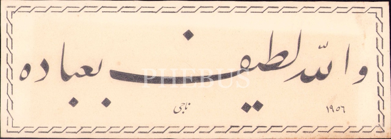 Naci Akverdi ketebeli ve 1956 tarihli ta'lik yazı: "Vallâhu Latîfun bi-ibâdihi [Allah kullarına lütüfukârdır]", 10x28 cm