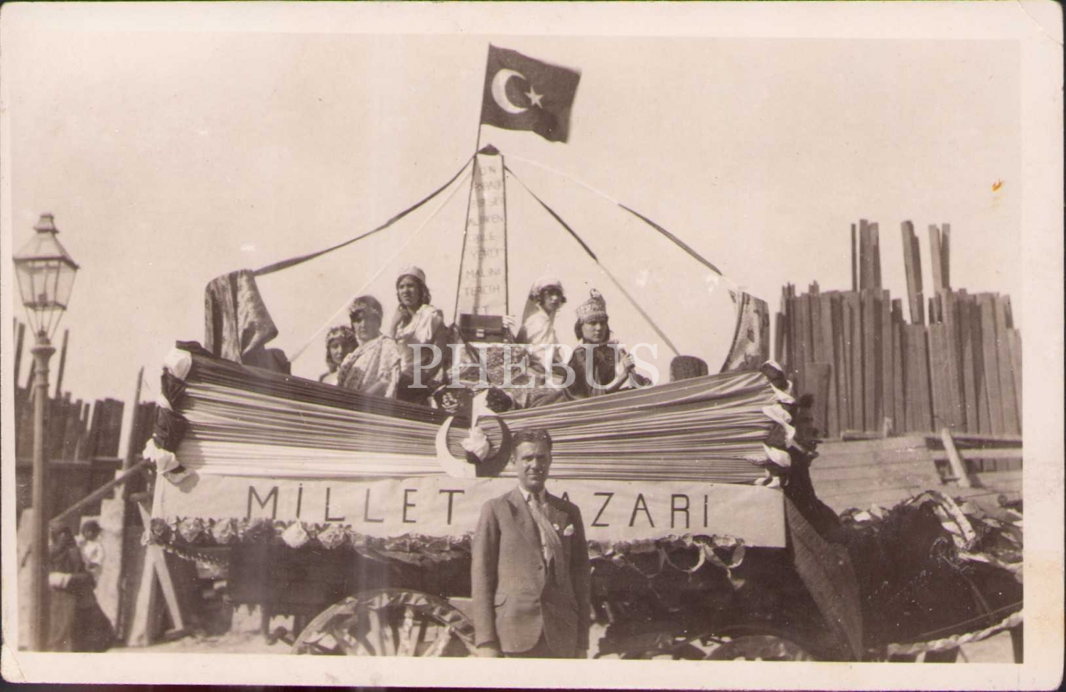 "Millet Pazarı" yazılı at arabası önünde hatıra fotoğrafı, Hamza Rüstem-İzmir soğuk damgalı