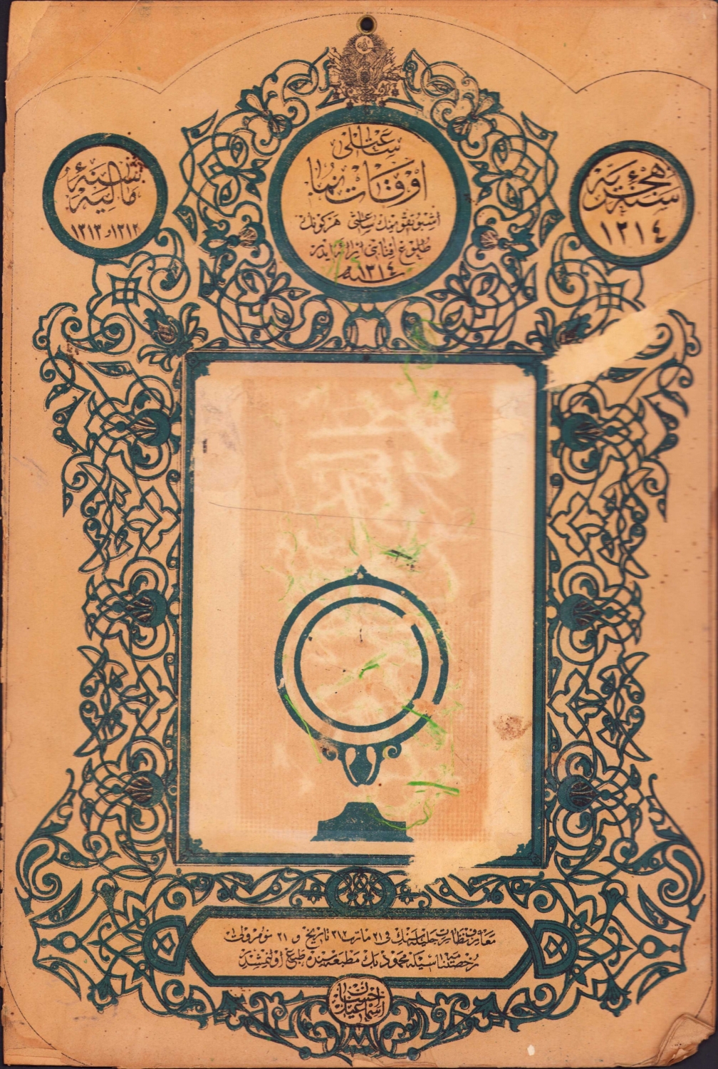 Osmanlı 1314 tarihli Saatli Evkat Takvim kartoneti, 23x35