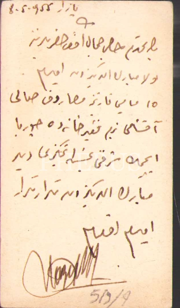 Hacı Cemal Efendi için imzalanan kartvitizin arkasına, "Evvela mübarek ellerinizden öperim. 15 Mayıs tarihine müsadif salı akşamı bizim fakirhanede çorba içmek şerefini bahşetmenizi diler mübarek ellerinizden tekrar tekrar öperim Efendim" notu ve 1955 tarihi düşülmüştür.