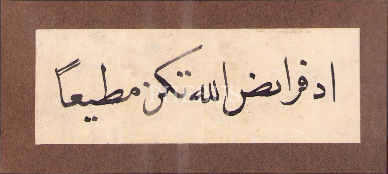 Nesih yazı: "Eddi ferâizallahe tekün mutîan [Allah'ın farz olan emirlerini yerine getir ki itaatkâr olasın]", 6x15 cm