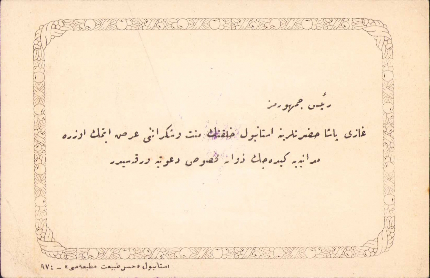 Mustafa Kemal Atatürk Osmanlıca davetiye, "Reisi Cumhurumuz, Gazi Paşa hazretlerine İstanbul halkının minnet şükranını arz etmek üzere medarına (dönüşüne) gidecek zevata mahsus davetiye varakasıdır.", 9x14 cm