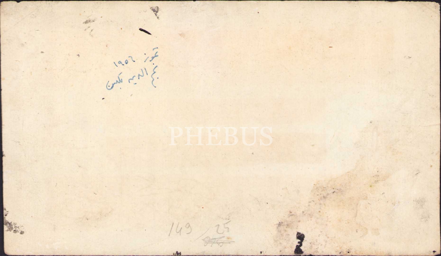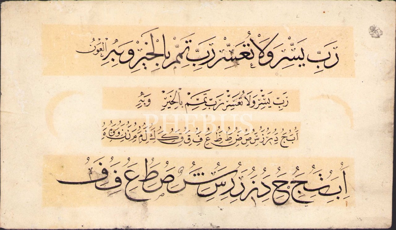 Sülüs nesih "Rabbi yessir" ve hurufat meşki, arkada Osmanlıca "Temmuz 1956 Necmeddin Bey'den" ifadesi bulunmakta, 24x14 cm
