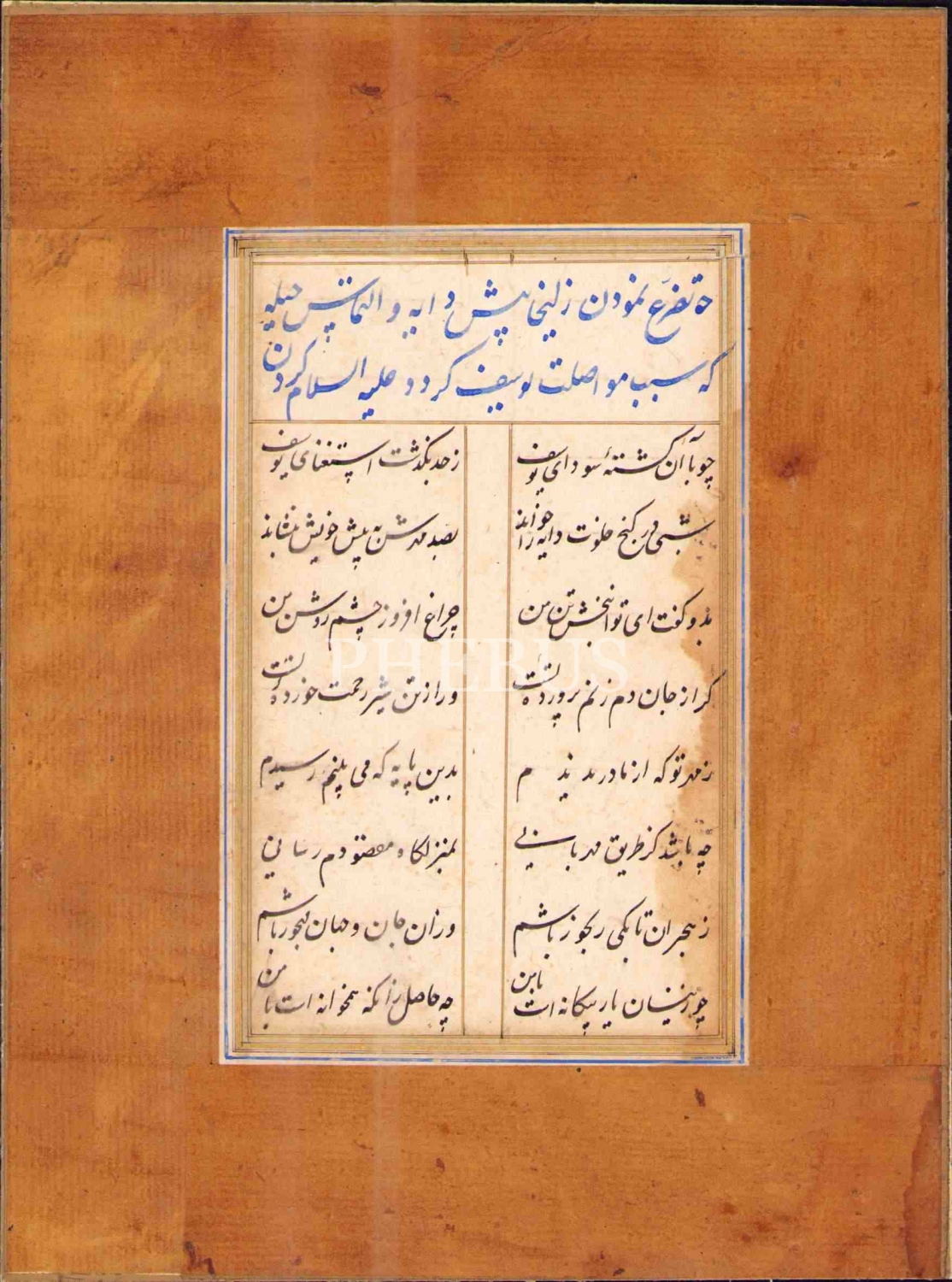 Erken dönem, Farsça ta'lik beyitler, altın cetvelli, murakka üzerinde, yazı: 8x13 cm