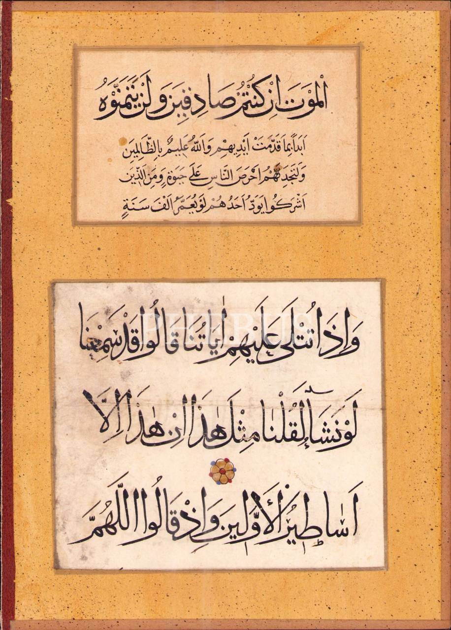 Erken dönem hoca işi nesih ve muhakkak ayetler (Bakara/94-96 -Ahkâf/8-Enfâl/30-31), murakkaya yapıştırılmış iki sayfa, 20x28 cm