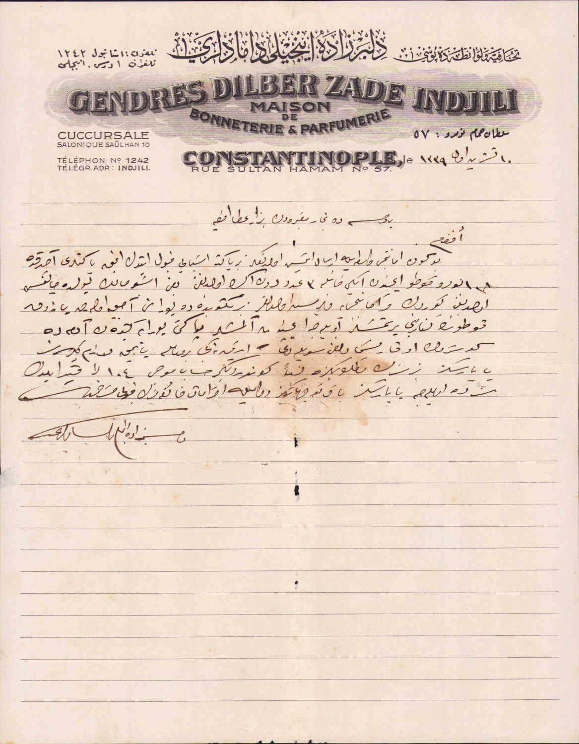 Osmanlıca - Fransızca Dilberzade İncili Damatları - Parfüm Evi Constantinople antetli iş yeri yazışması