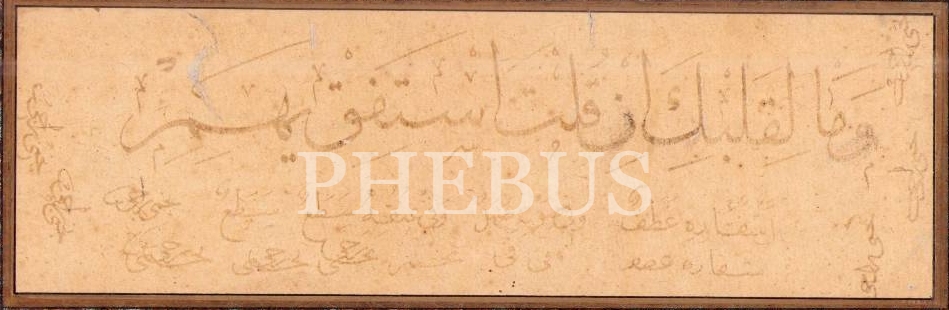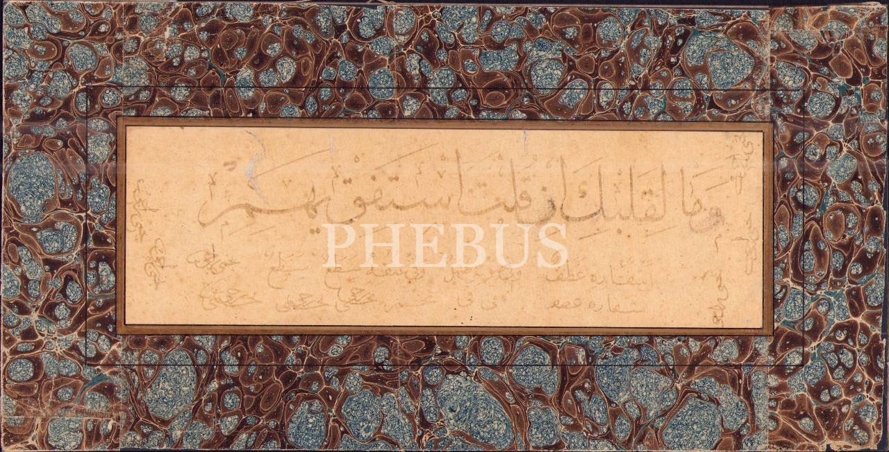 Ebru pervazlı sülüs-nesih yazı: Kasîde-i Bürde'den beyitler ve Necmi Raci imza denemeleri, yazı solmuş haliyle, 25x35 cm
