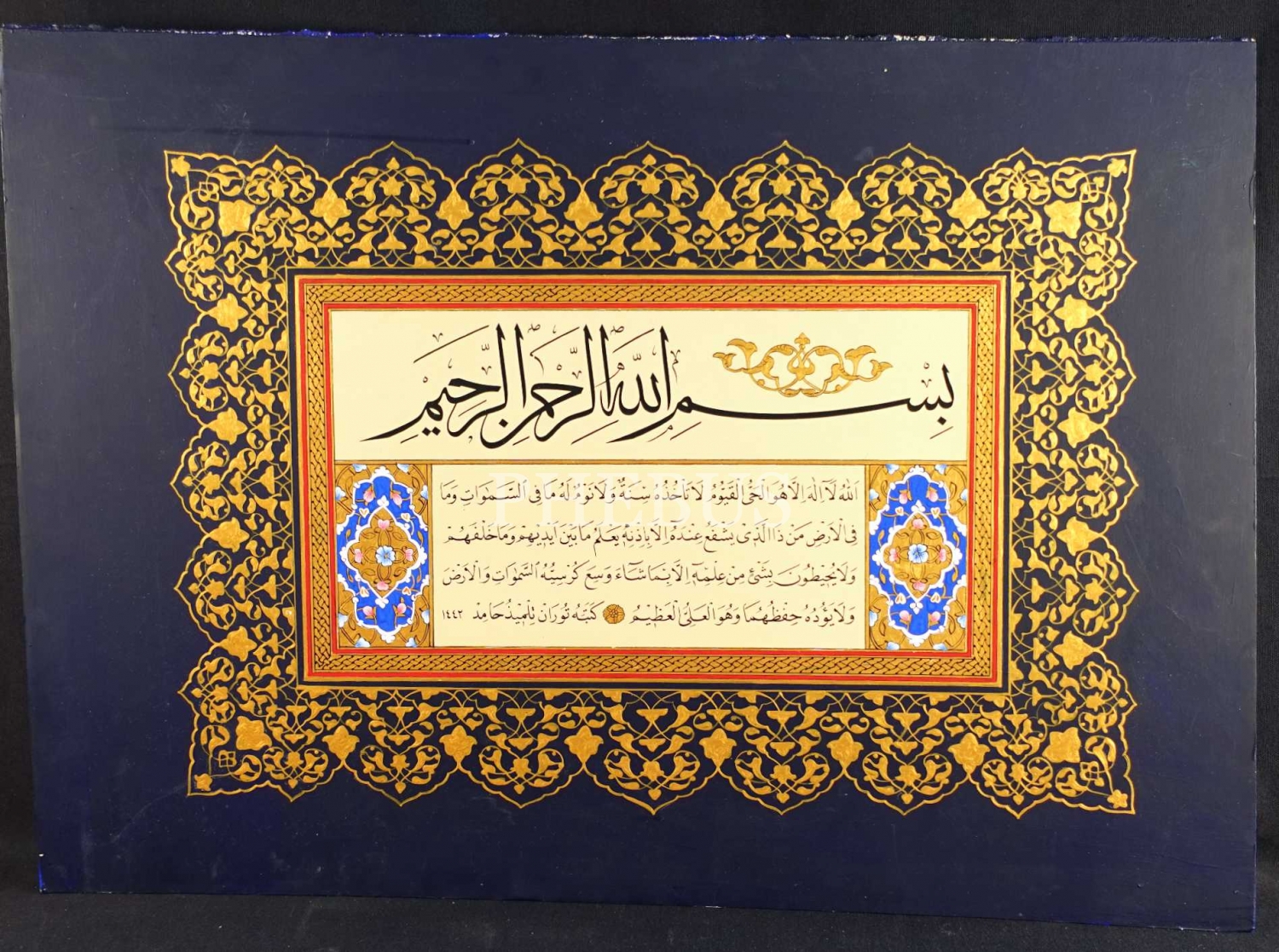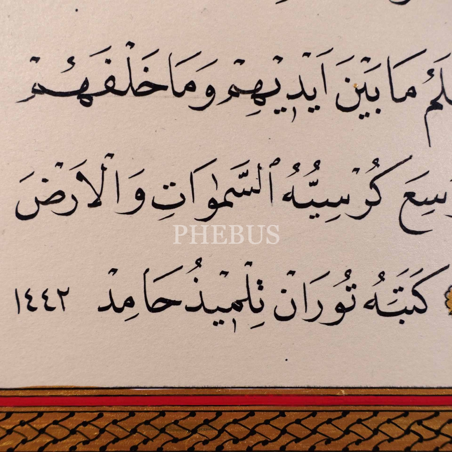 Turan Sevgili ketebeli muhakkak besmele ve nesih Ayete'l-Kürsi, tezhipli, yazı: 23x40 cm, paspartu:50x70 cm